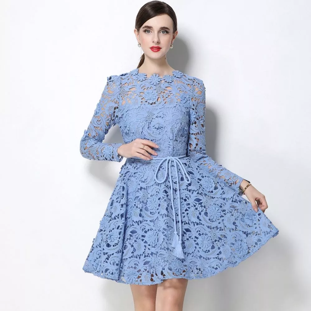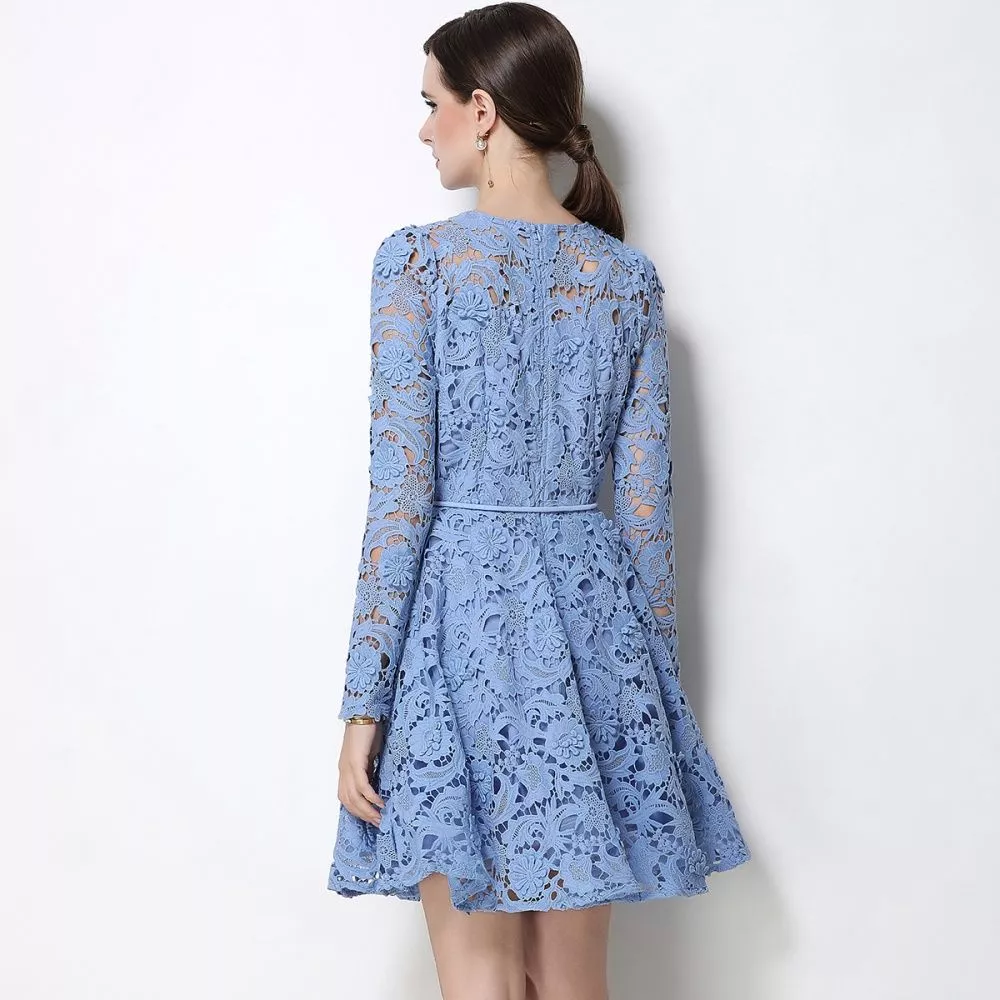 Vestito Corto Elegante Donna in Pizzo Manica Lunga Vita Alta Svasato Blu CF70621