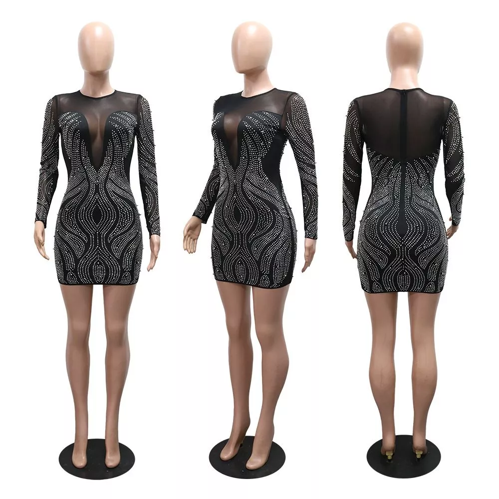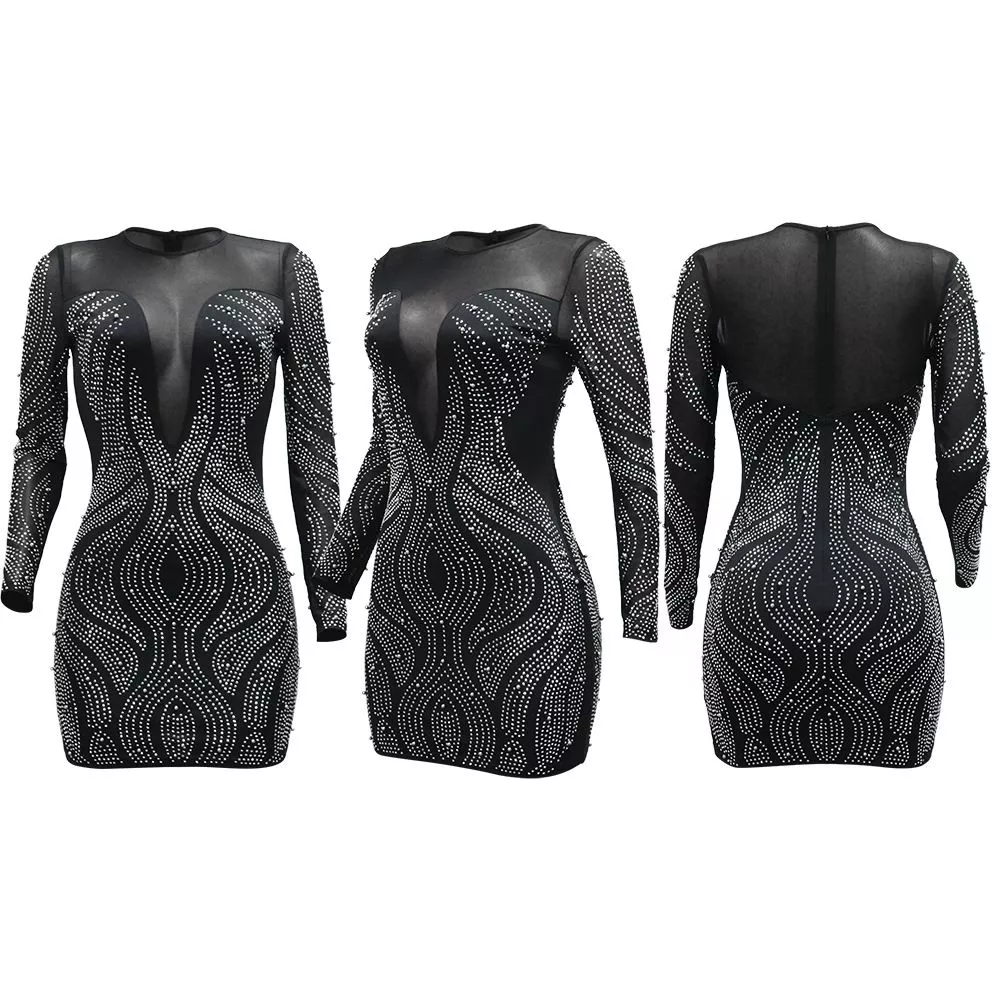 Vestito corto elegante con inserti trasparenti e strass perfetto per party, serate e occasioni glamour. La silhouette aderente valorizza la figura mentre il gioco di trasparenze crea un effetto raffinato e sensuale.
