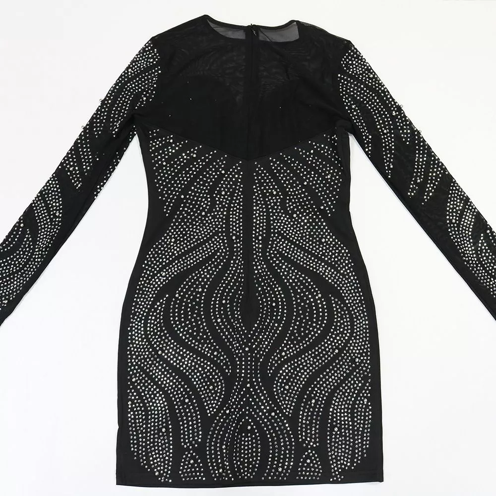 Vestito Corto Elegante Nero Trasparenze Strass Maniche Lunghe CF67153