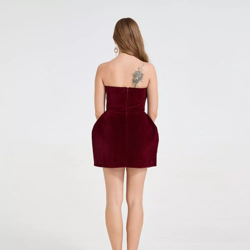 Vestito Corto Elegante Sera Senza Spalline Rosso Vino Dettagli Scultorei CF58667