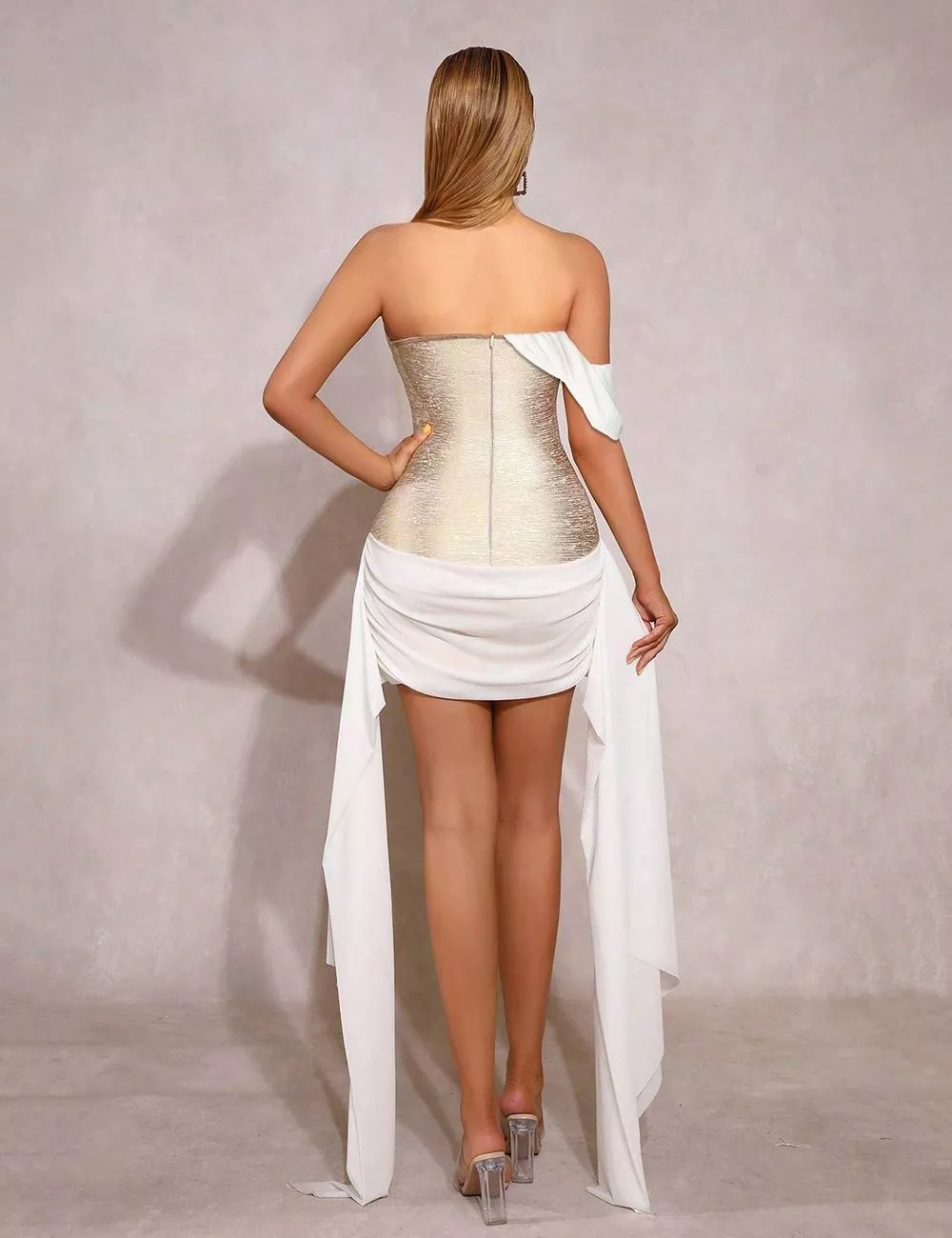 estito corto oro dal design scenografico con monospalla bianca e corpetto effetto metallizzato che valorizza la silhouette. La gonna mini drappeggiata crea movimento mentre lo strascico laterale in chiffon dona un tocco glamour e raffinato.
