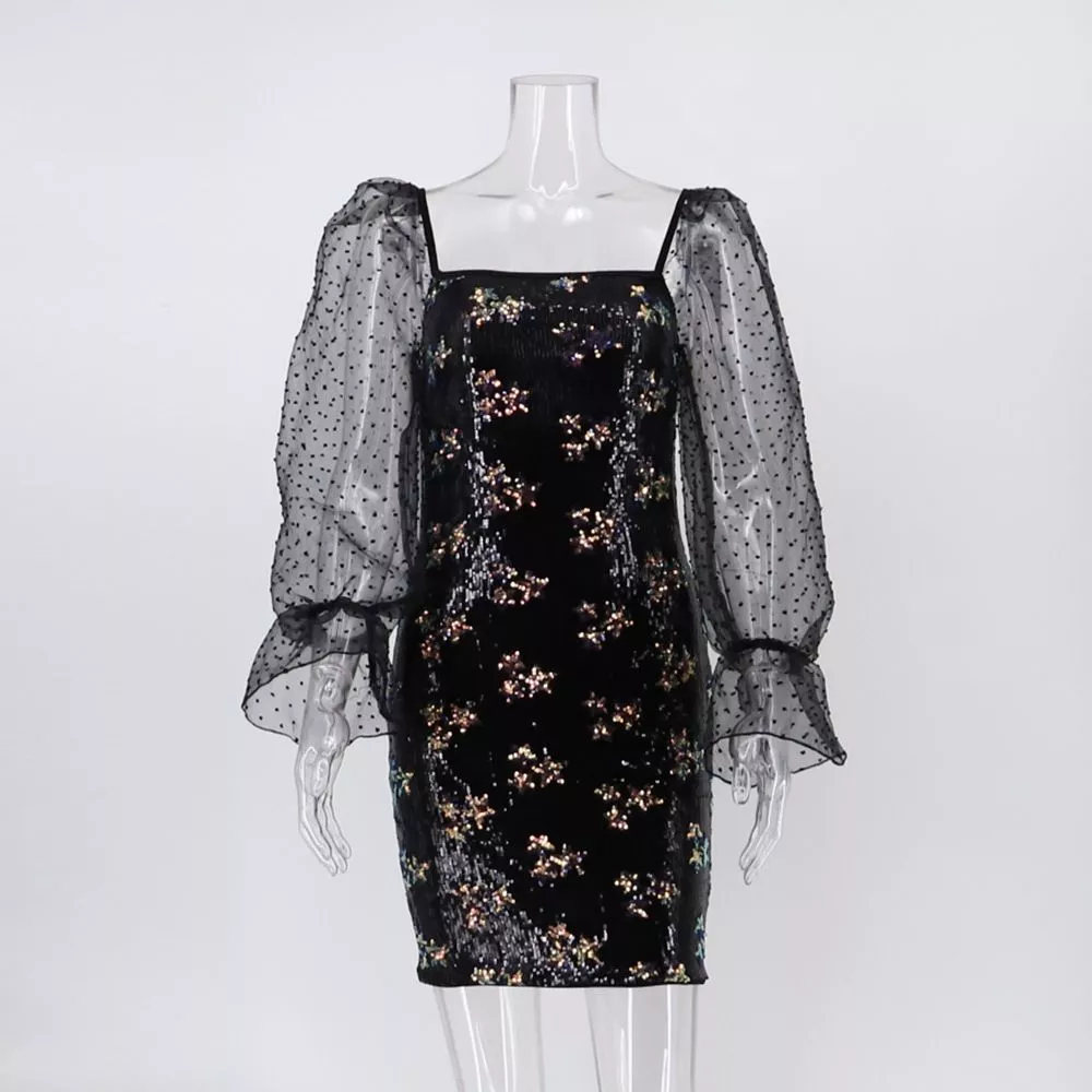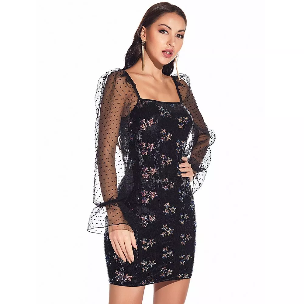 Vestito Corto Sera Nero Paillettes Con Maniche In Tulle Elegante Eventi CF60302