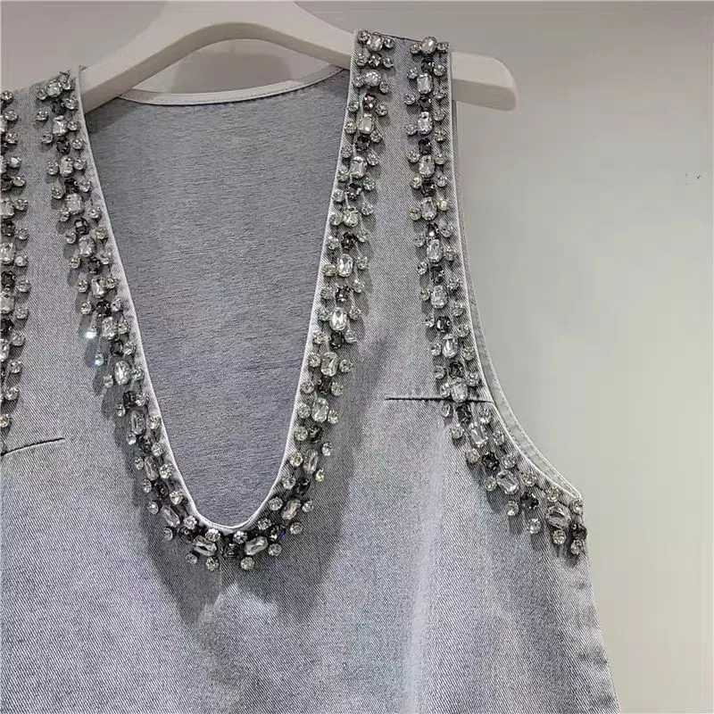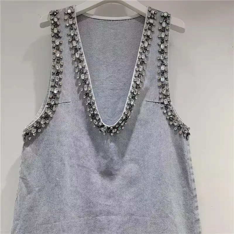 Vestito mini in denim dal carattere moderno e glamour, pensato per chi ama distinguersi con un look deciso e sofisticato. Il design minimal è valorizzato dallo scollo profondo impreziosito da applicazioni gioiello luminose che incorniciano il décolleté creando un effetto elegante e contemporaneo. La linea dritta scivola delicatamente sulla silhouette rendendo il capo versatile e facile da abbinare, mentre il denim leggero dona un tocco urbano perfetto per outfit serali, feste e occasioni speciali. Un vestito dal forte impatto visivo che combina semplicità e dettagli ricercati per uno stile femminile e moderno.