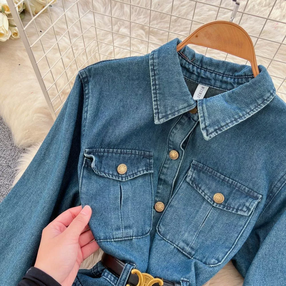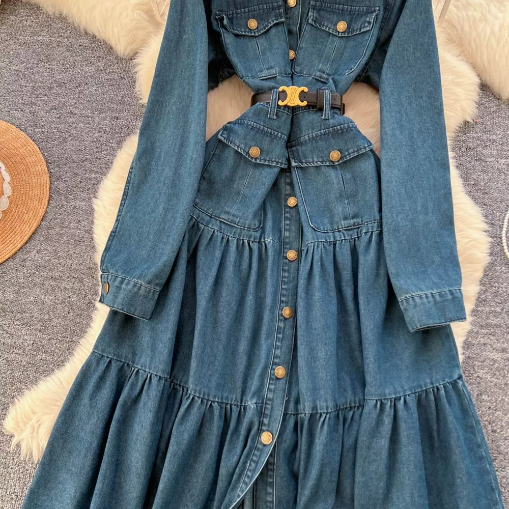 Un vestito in denim elegante e strutturato, con linea definita in vita grazie alla cintura decorativa che valorizza la silhouette. Il design a camicia con bottoni frontali dona un carattere distintivo, mentre la gonna morbida a più livelli crea un movimento armonioso e femminile. Un modello moderno ma con richiami retrò, perfetto per look quotidiani sofisticati, uscite serali o occasioni casual chic. La tonalità blu denim si abbina facilmente e rende il capo versatile in ogni stagione.
