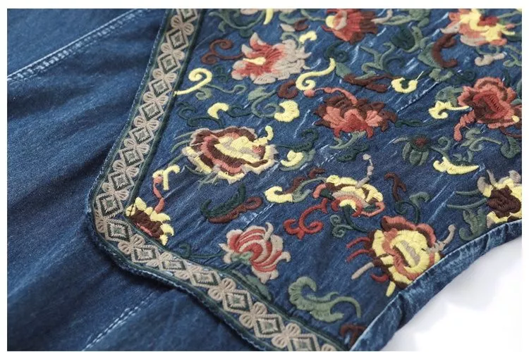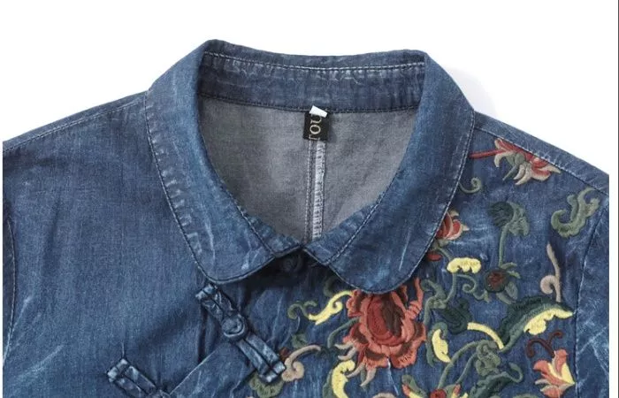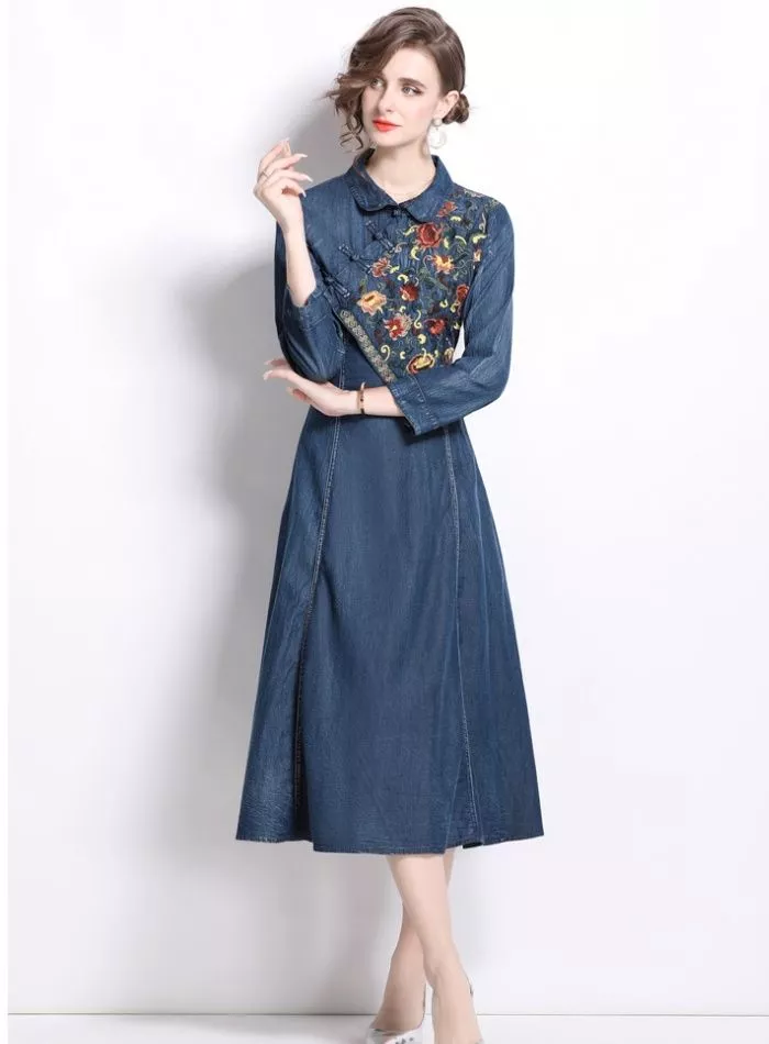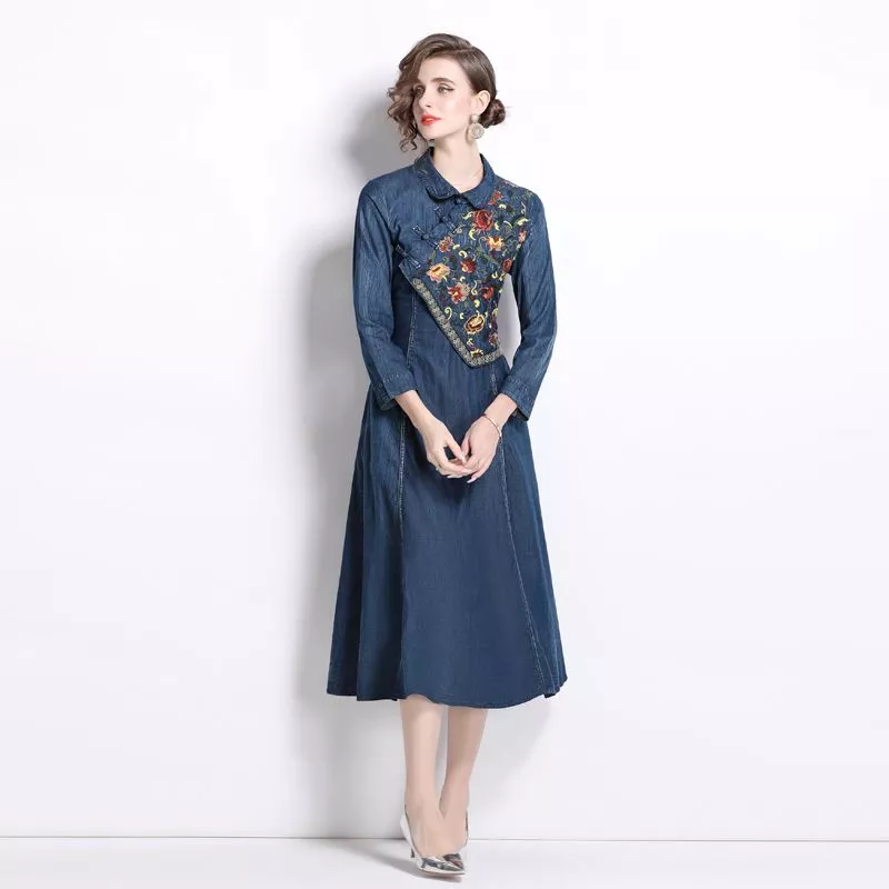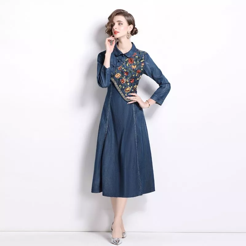 Vestito Denim Ricamo Floreale Elegante Maniche Lunghe Midi Bon Ton CF66563