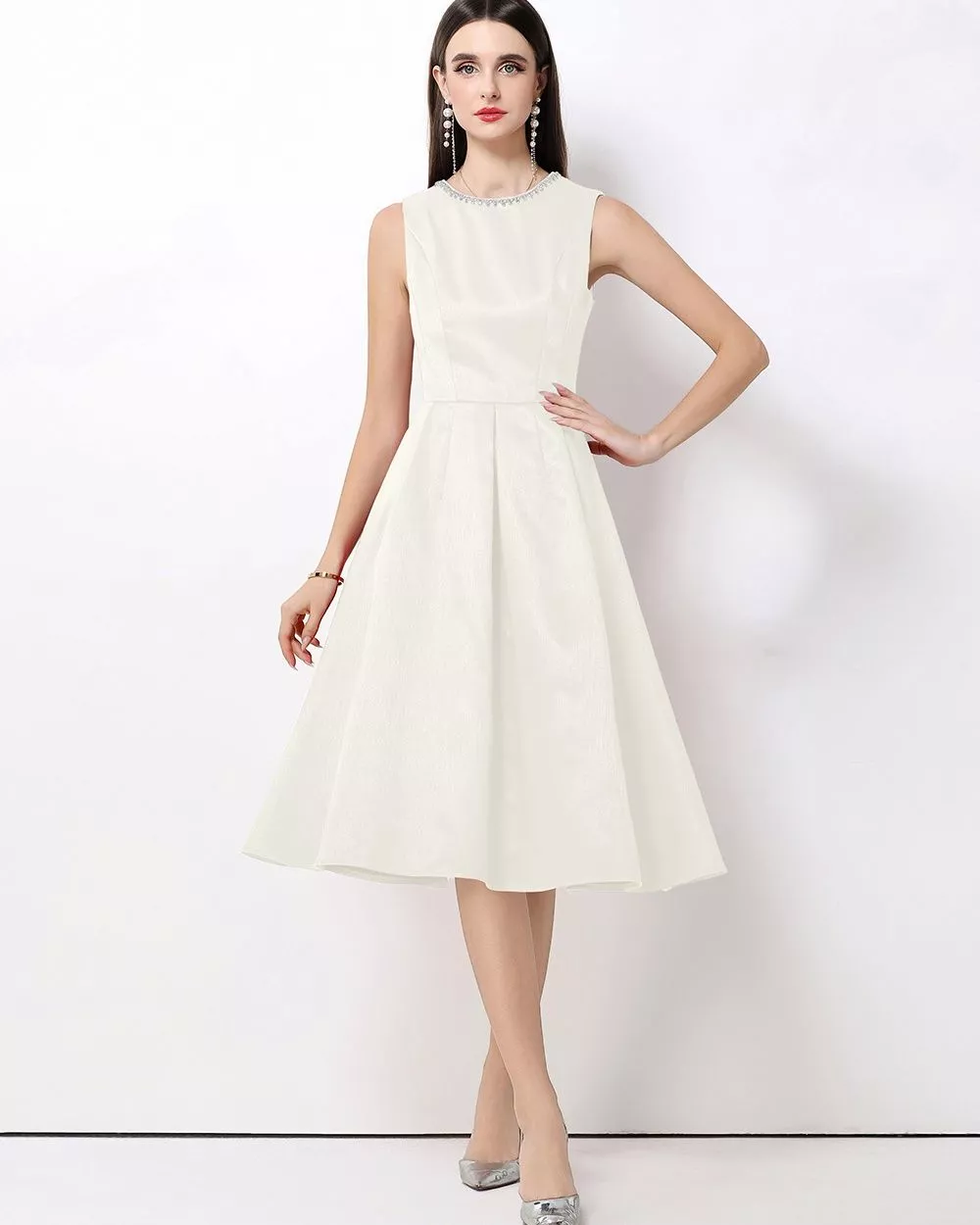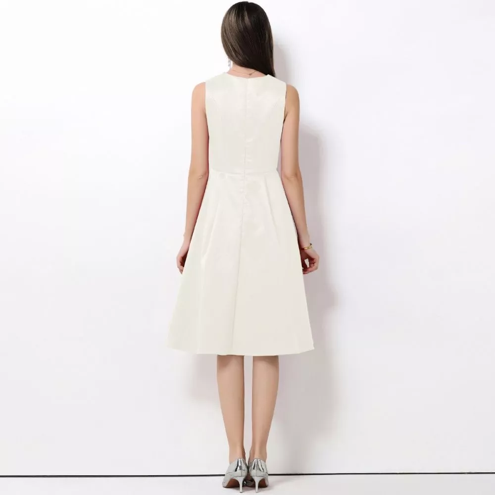 Vestito da donna dal design elegante e femminile, caratterizzato da una linea pulita e raffinata. Il modello presenta una silhouette svasata con gonna midi a ruota che accompagna il movimento con naturalezza, valorizzando la figura in modo armonioso. Il taglio senza maniche e il girocollo semplice rendono questo vestito ideale per cerimonie, eventi formali e occasioni speciali, ma anche perfetto per un look curato da giorno. Un capo pensato per chi cerca uno stile elegante, sobrio e senza tempo.