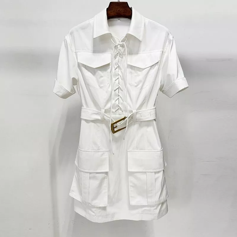 Vestito donna corto dal design pratico e moderno, caratterizzato da maniche corte, allacciatura frontale regolabile e cintura coordinata che definisce la silhouette.