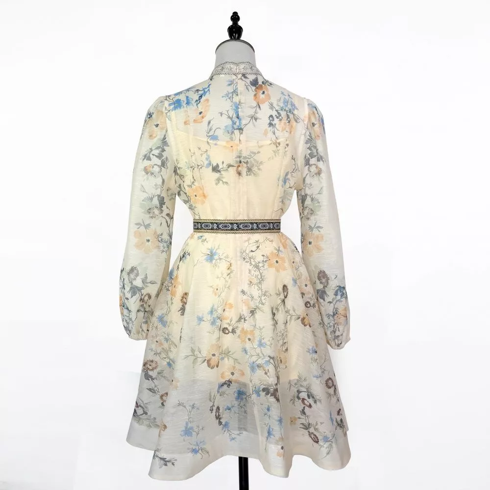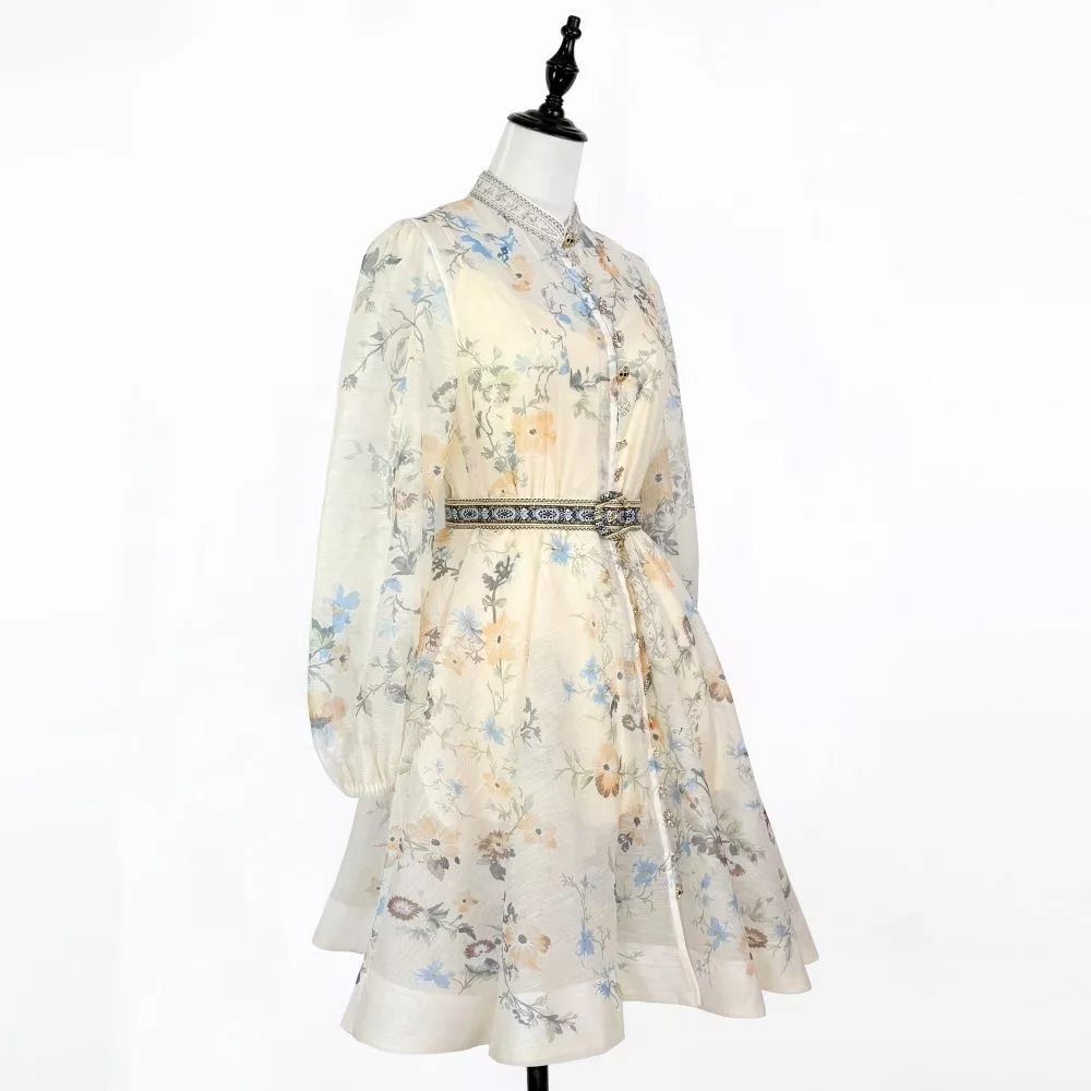 Vestito donna elegante con stampa floreale romantica e cintura coordinata che valorizza la silhouette. La linea svasata e le maniche lunghe leggere creano un look raffinato e femminile perfetto per cerimonie, eventi e occasioni speciali. Il design fluido e la vestibilità armoniosa rendono questo abito ideale per outfit chic e senza tempo.