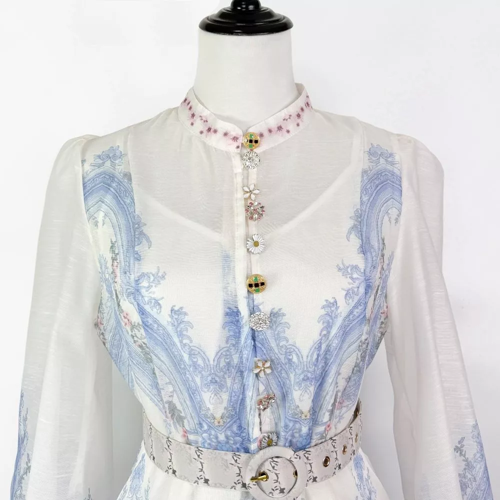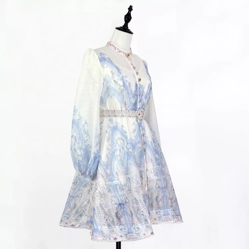 Vestito donna elegante con stampa floreale romantica e cintura coordinata che valorizza la silhouette. La linea svasata e le maniche lunghe leggere creano un look raffinato e femminile perfetto per cerimonie, eventi e occasioni speciali. Il design fluido e la vestibilità armoniosa rendono questo abito ideale per outfit chic e senza tempo.