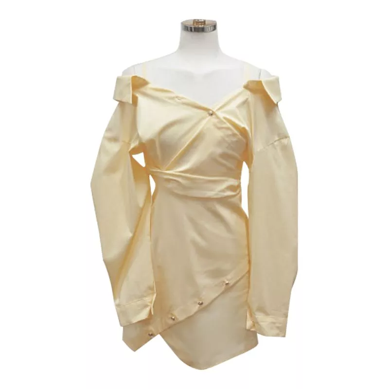 Vestito da donna elegante in tonalità giallo pastello, progettato per valorizzare la silhouette con una linea aderente e femminile. Il design con spalle scoperte e scollo incrociato crea un effetto raffinato e moderno, ideale per occasioni serali o eventi.