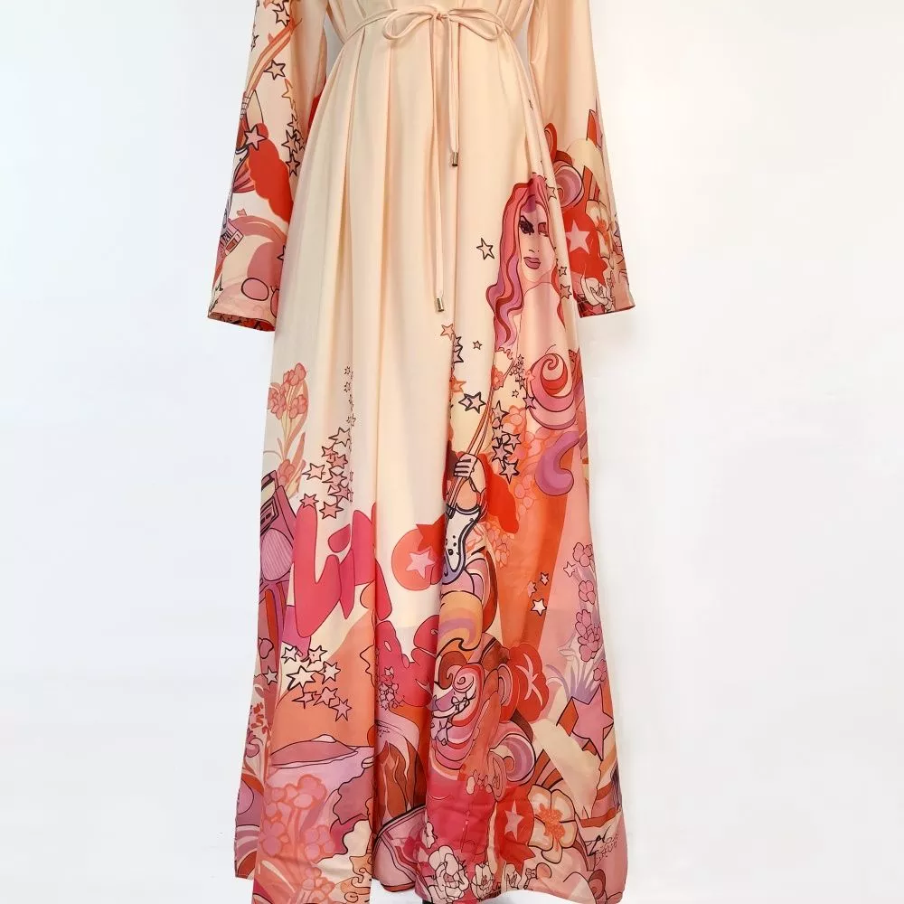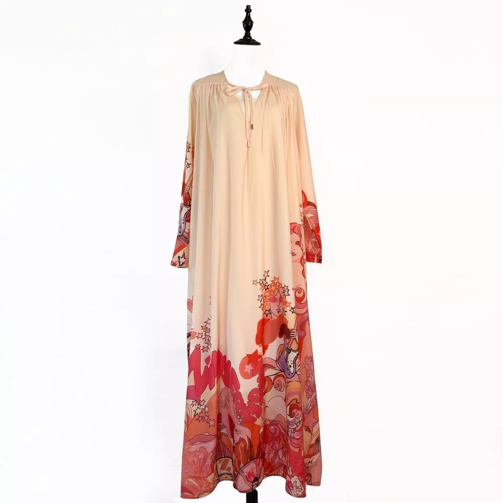 Vestito lungo da donna dallo stile boho elegante, caratterizzato da una silhouette fluida e da una raffinata fantasia floreale che valorizza il movimento del tessuto. Il design morbido accompagna la figura senza costringerla, creando un look femminile e armonioso, ideale sia per il tempo libero che per occasioni informali curate.