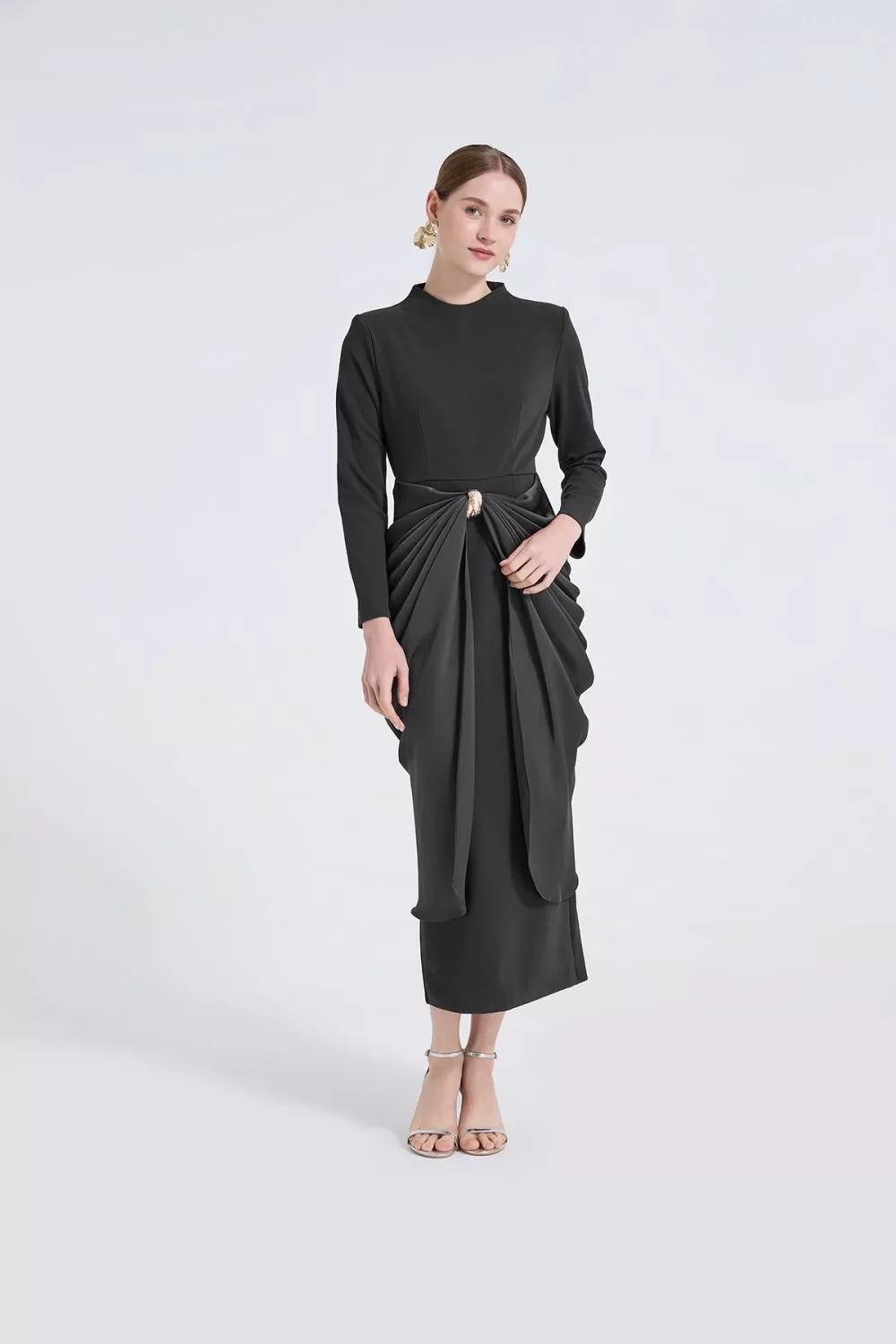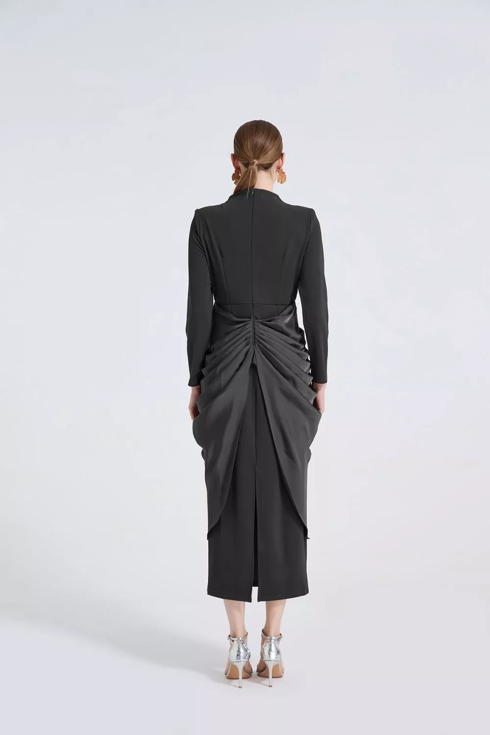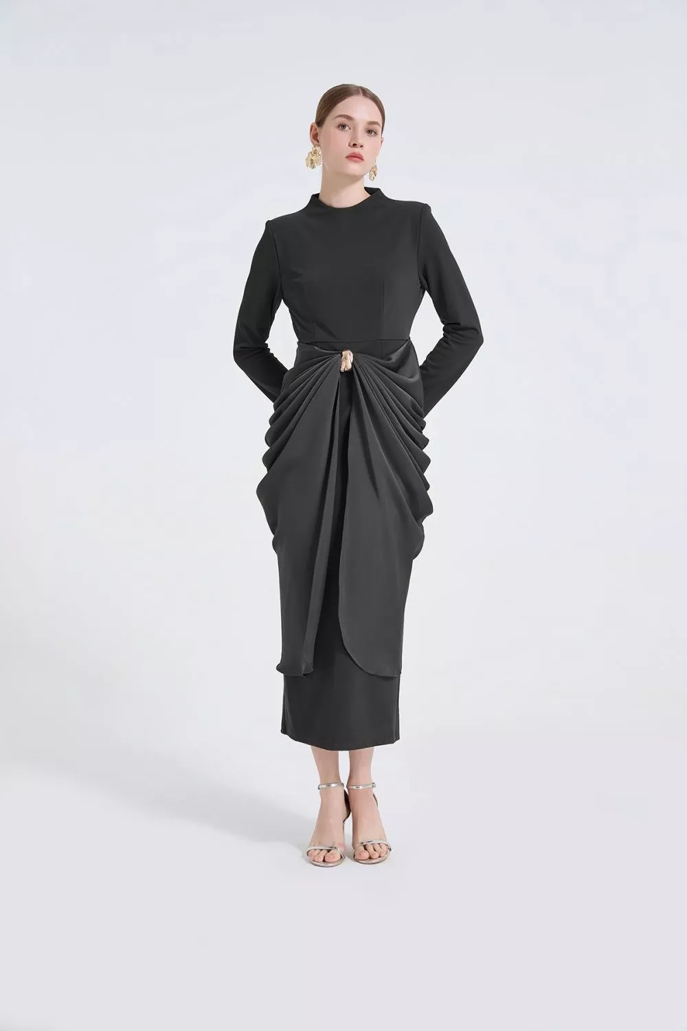 Vestito donna dal design elegante e sofisticato, caratterizzato da una linea aderente che valorizza la figura con equilibrio e raffinatezza. Il drappeggio centrale crea movimento e struttura visiva, donando un effetto scenografico pulito e femminile. Le maniche lunghe e la lunghezza sotto il ginocchio rendono questo abito ideale per cerimonie, eventi serali e occasioni formali in cui è richiesto uno stile ricercato e deciso. Un modello pensato per distinguersi con classe, mantenendo una vestibilità armoniosa.