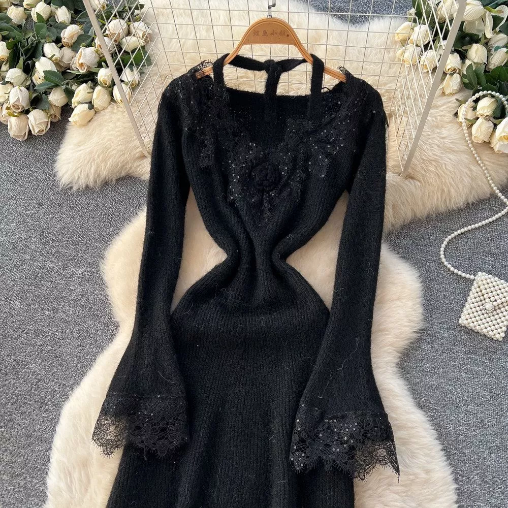 Vestito donna elegante in maglia lavorata, caratterizzato da una raffinata combinazione di pizzo floreale e linea sagomata che valorizza la silhouette. Il design con vita definita e gonna leggermente svasata crea un equilibrio femminile e armonioso, perfetto per occasioni eleganti, serate speciali ed eventi curati.
