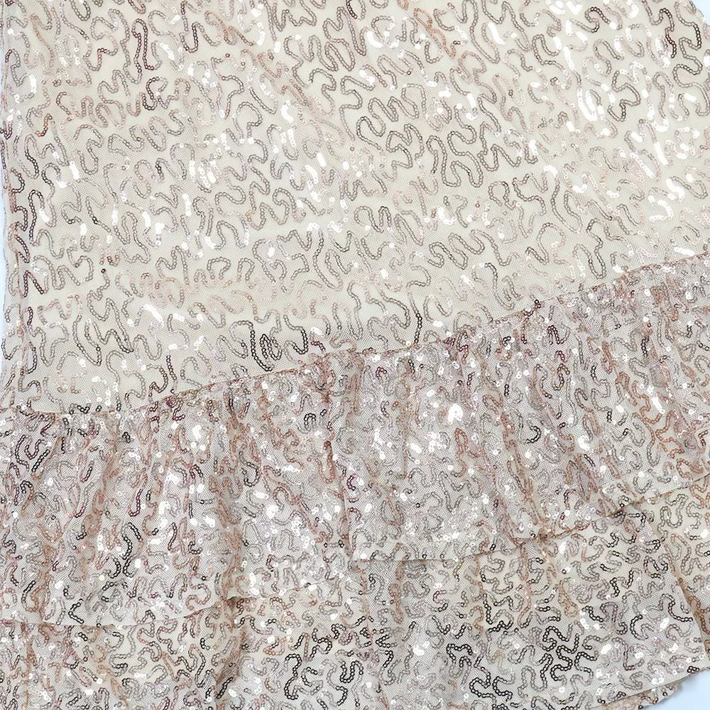 Il collo alto stile halter incornicia le spalle lasciandole scoperte, donando equilibrio tra sensualità ed eleganza. La parte superiore è impreziosita da una lavorazione con paillettes, che cattura la luce e crea un delicato contrasto con la base più morbida del tessuto.