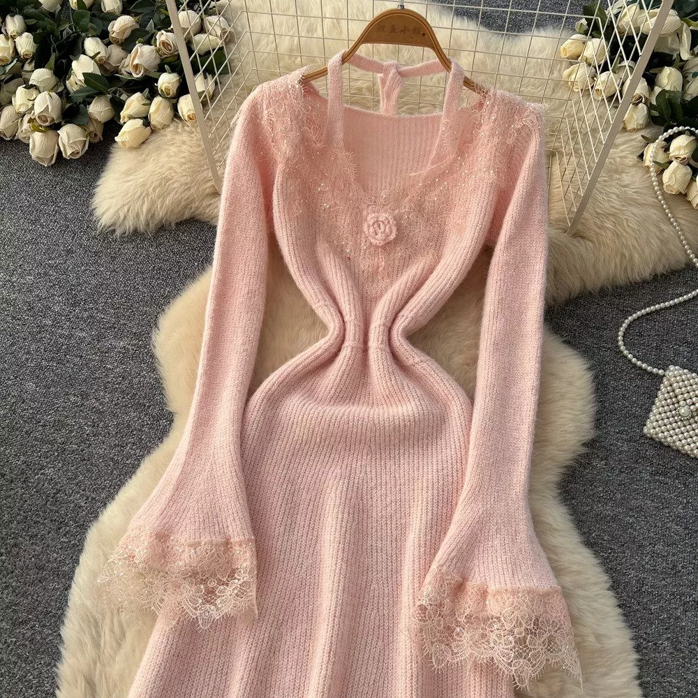 Vestito Donna Rosa In Maglia Con Pizzo Floreale E Vita Sagomata Delicata CF63958
