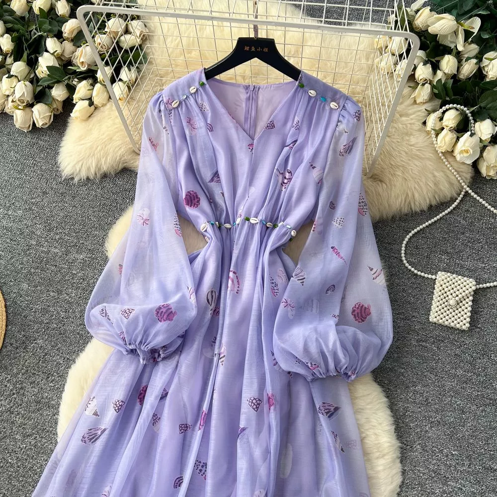 Vestito Donna Viola Chiaro Lungo Fantasia Floreale Maniche A Palloncino CF62844
