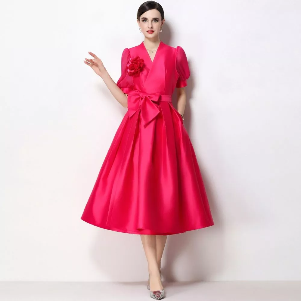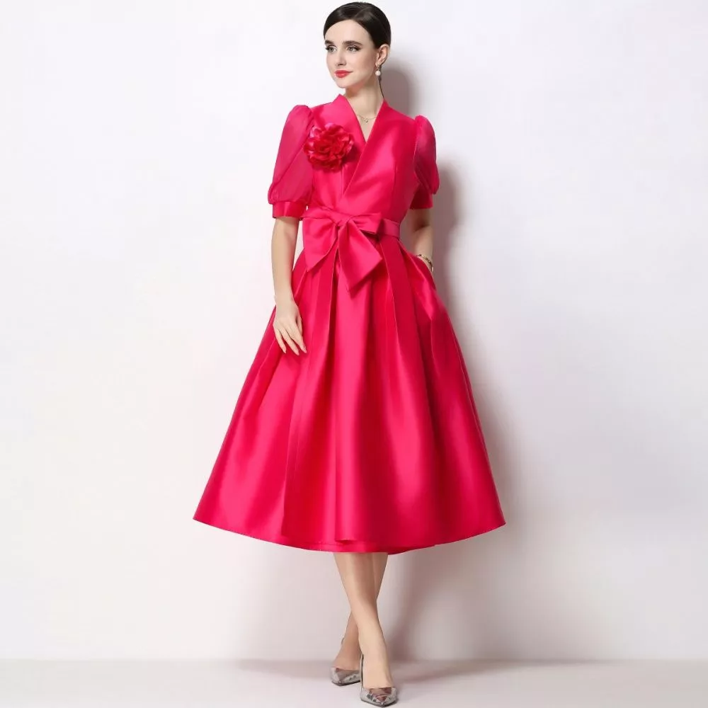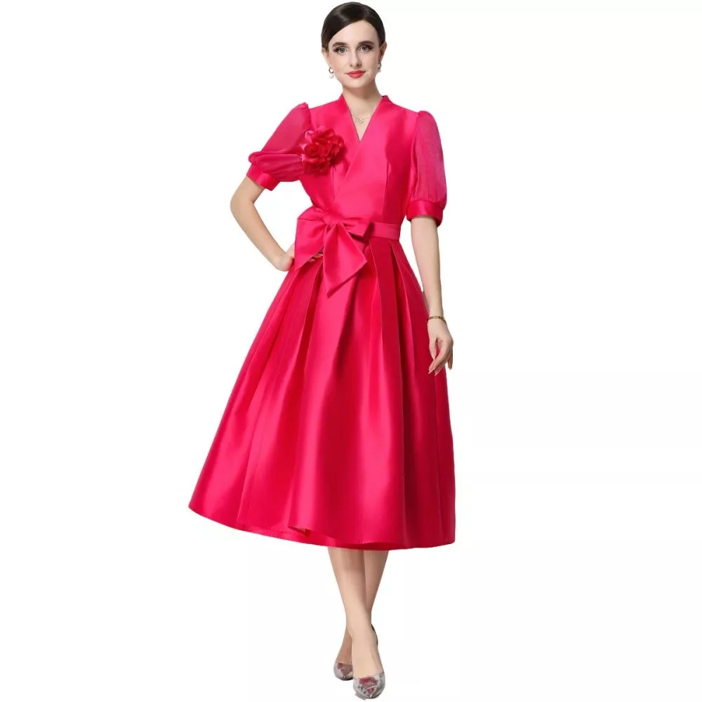 Vestito Elegante Cerimonia Rosa Fluo Midi Scollo V Ampio Volant CF69568