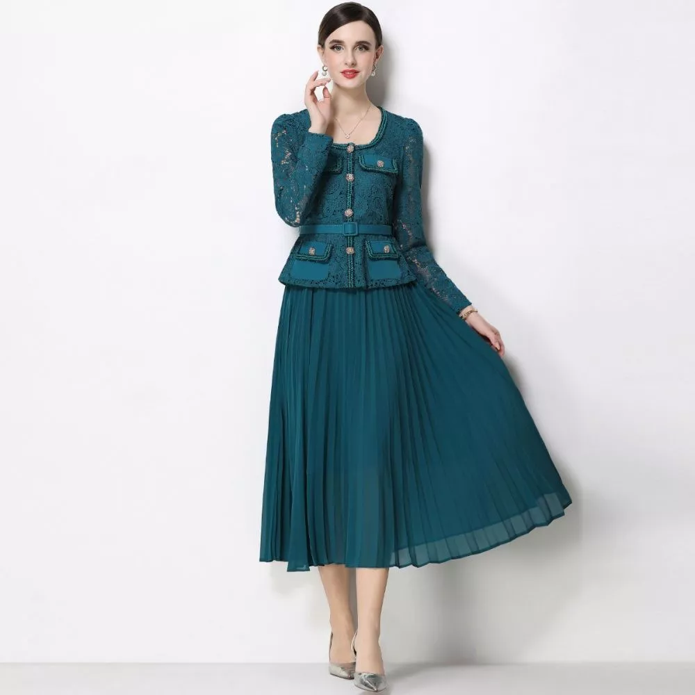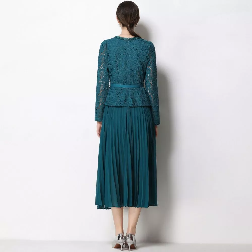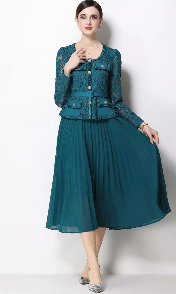 Vestito elegante da cerimonia in raffinata tonalità verde petrolio, caratterizzato da un design sofisticato che unisce un top in pizzo lavorato a una gonna midi plissettata fluida. La linea valorizza la silhouette con equilibrio e femminilità, mentre la cintura definisce il punto vita con discrezione. Il risultato è un look armonioso, ideale per eventi e occasioni formali dove è richiesta eleganza curata e distintiva.
