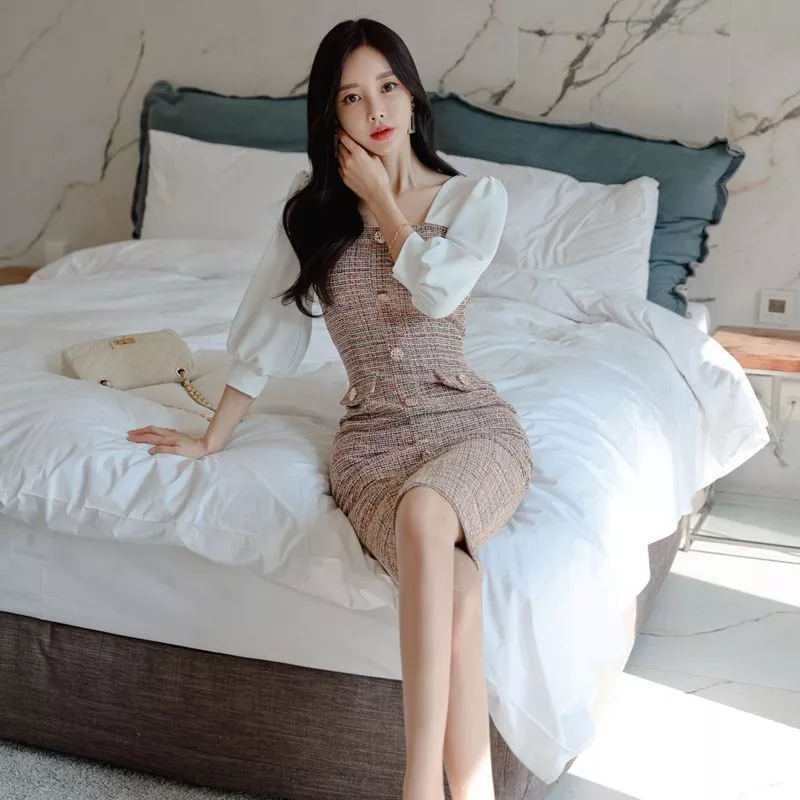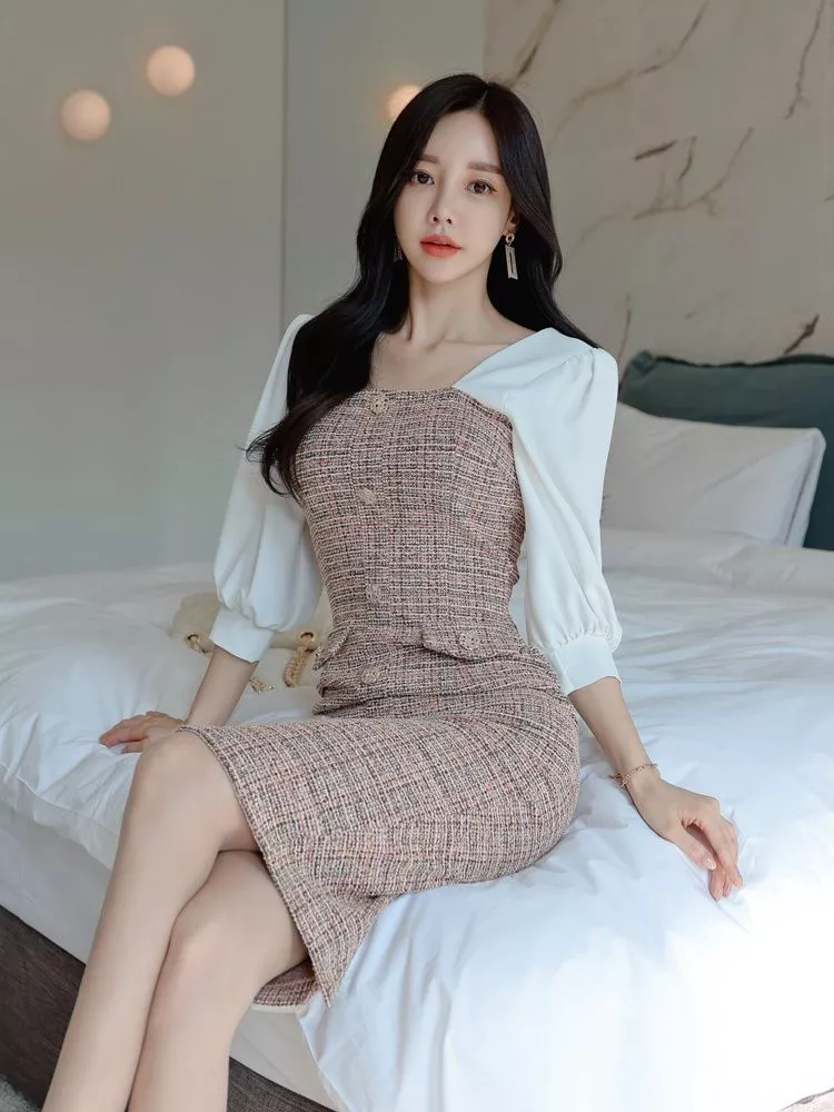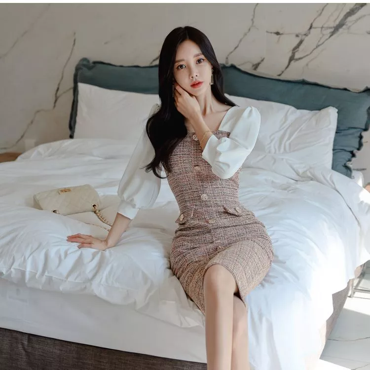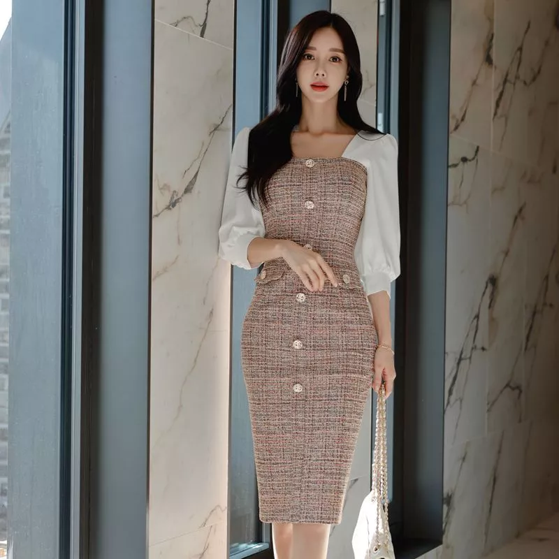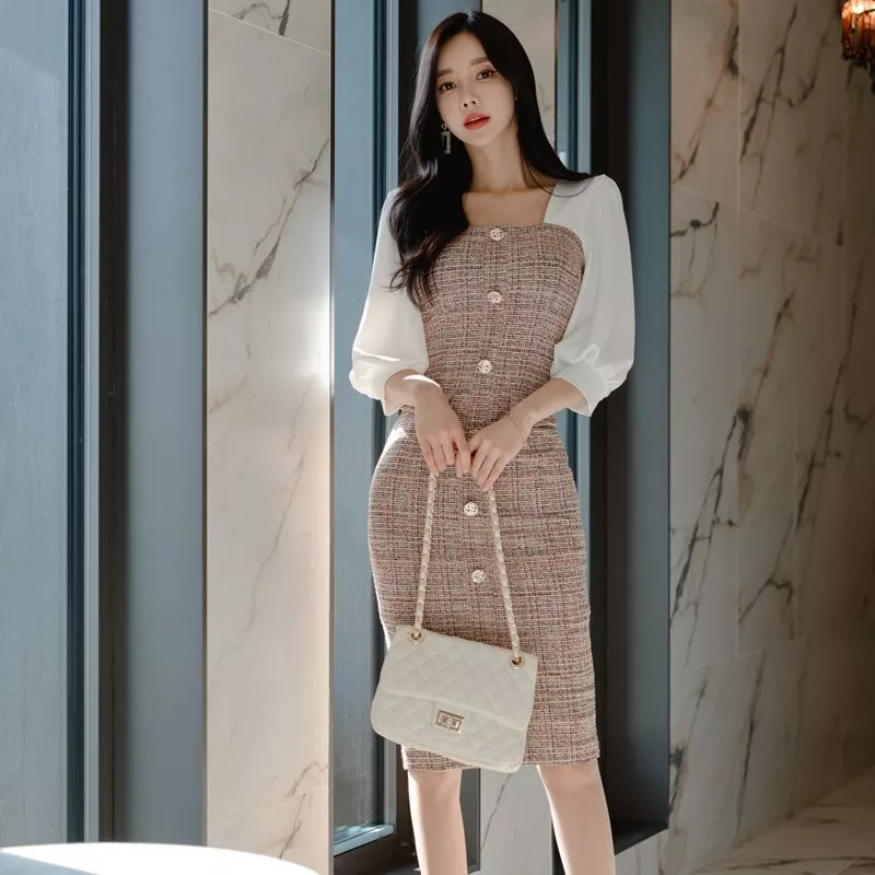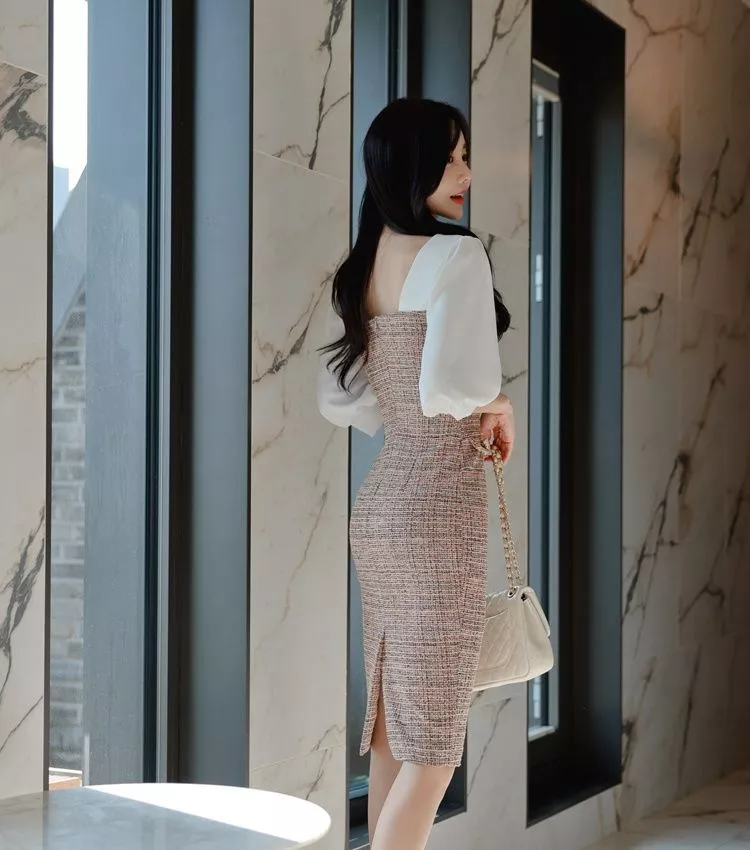Vestito elegante da donna con taglio aderente e raffinato effetto bicolore. Il busto in tessuto effetto tweed con bottoni frontali dona un tocco sartoriale, mentre le maniche in chiffon bianco leggero creano un contrasto delicato e femminile. La linea avvitata valorizza la silhouette senza rinunciare alla comodità, perfetta per un look sofisticato da cerimonia, evento o occasione speciale. Uno stile elegante e moderno che esalta la figura con classe.