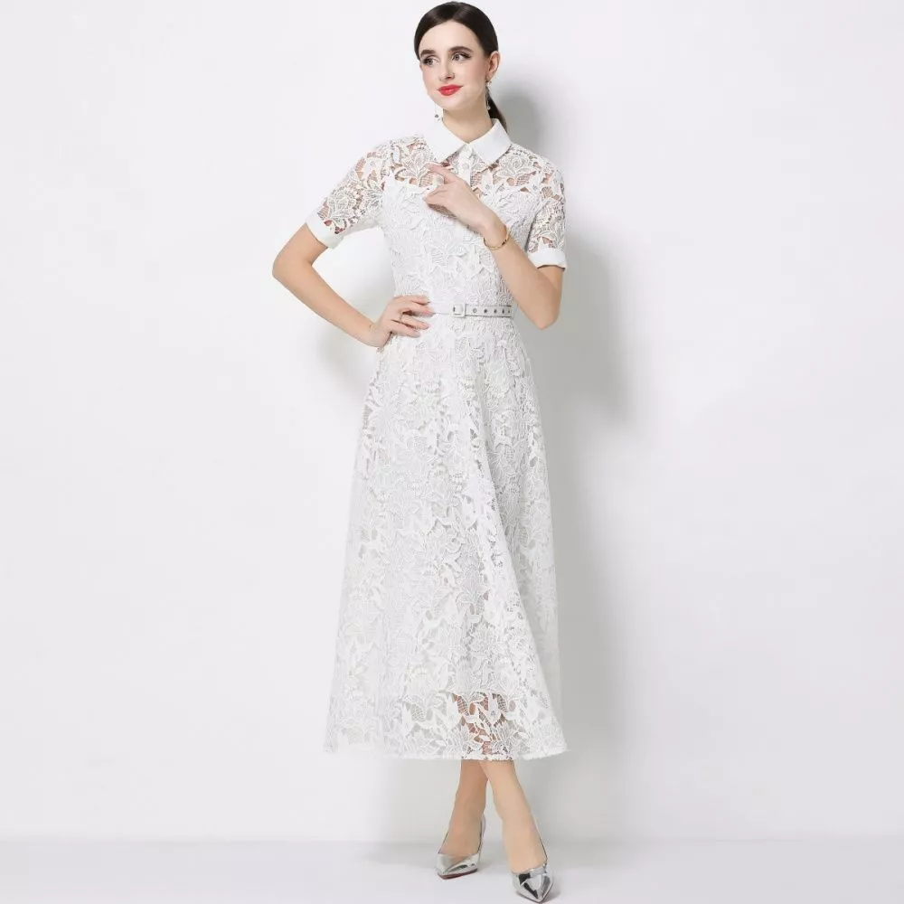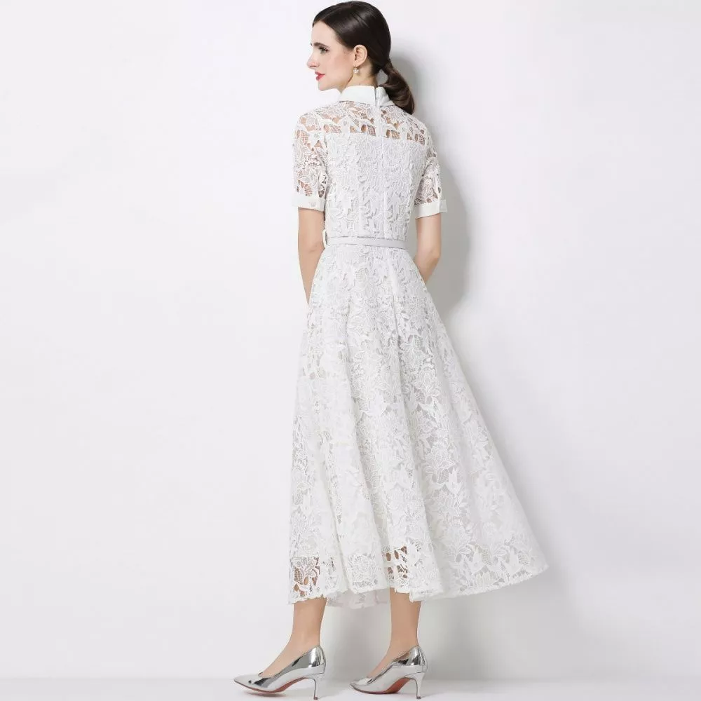 Vestito Elegante In Pizzo Con Cintura E Colletto Camicia Bianco CF68674
