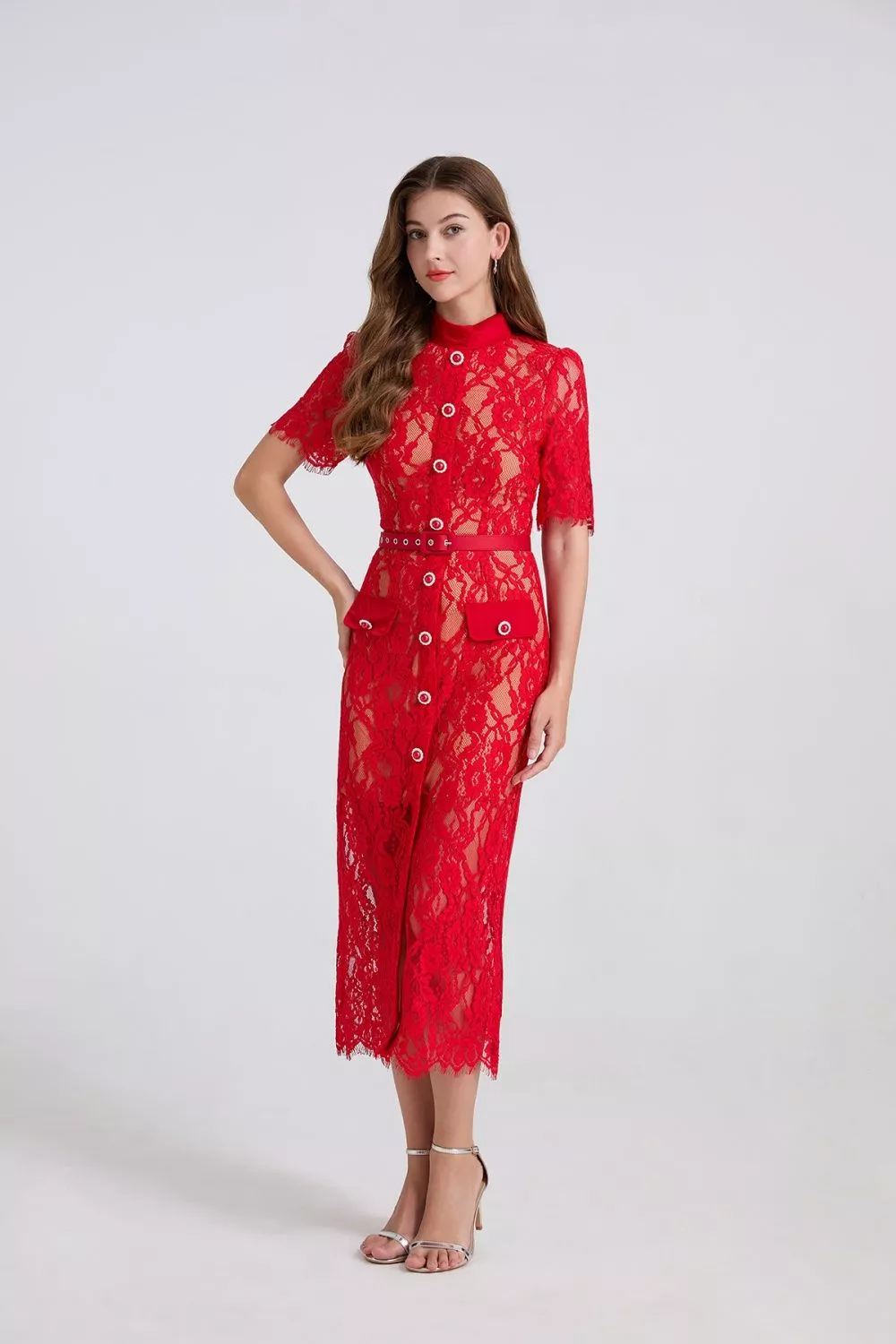 Vestito Elegante Longuette In Pizzo Con Cintura Rosso CF67062