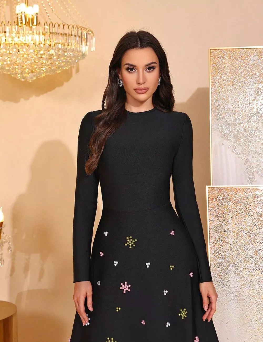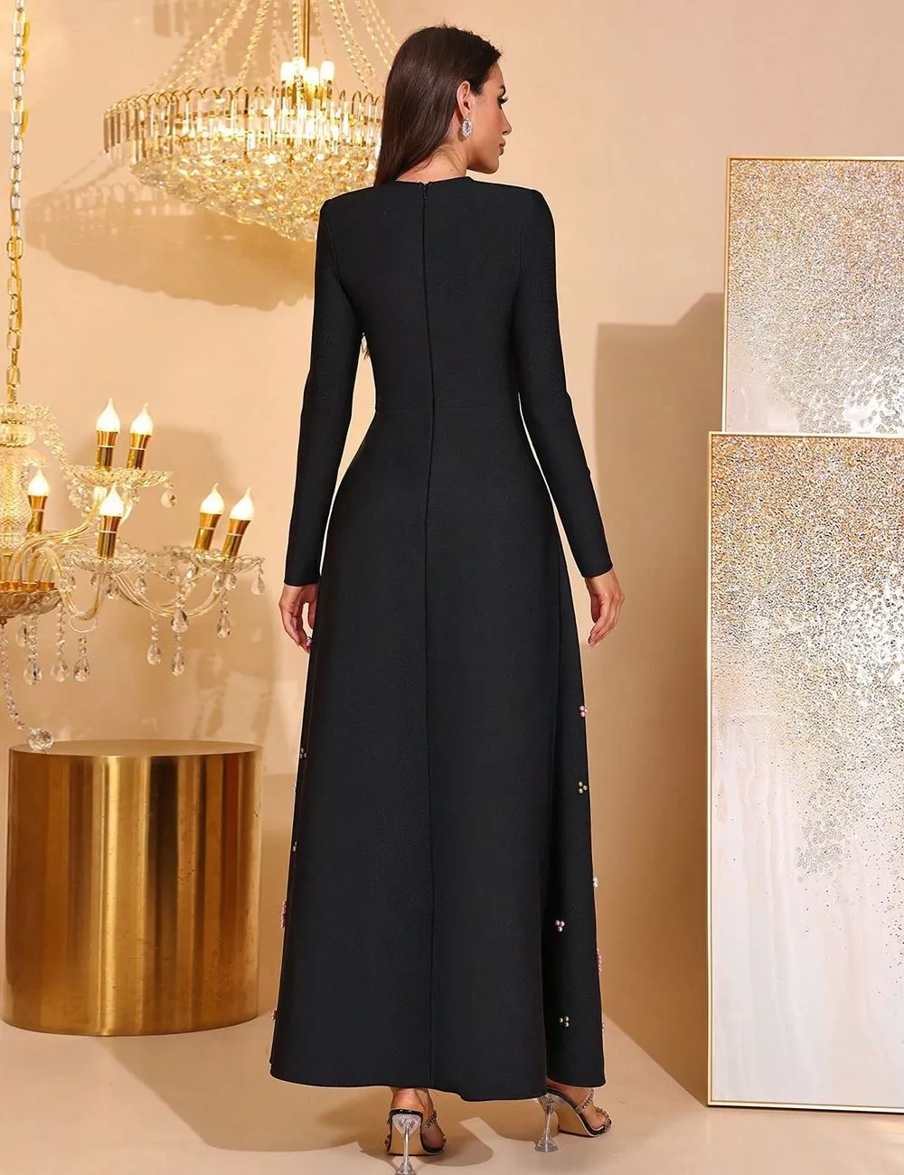 Vestito Elegante Lungo Con Perline Maniche Lunghe Nero Cerimonia Sera CF61272