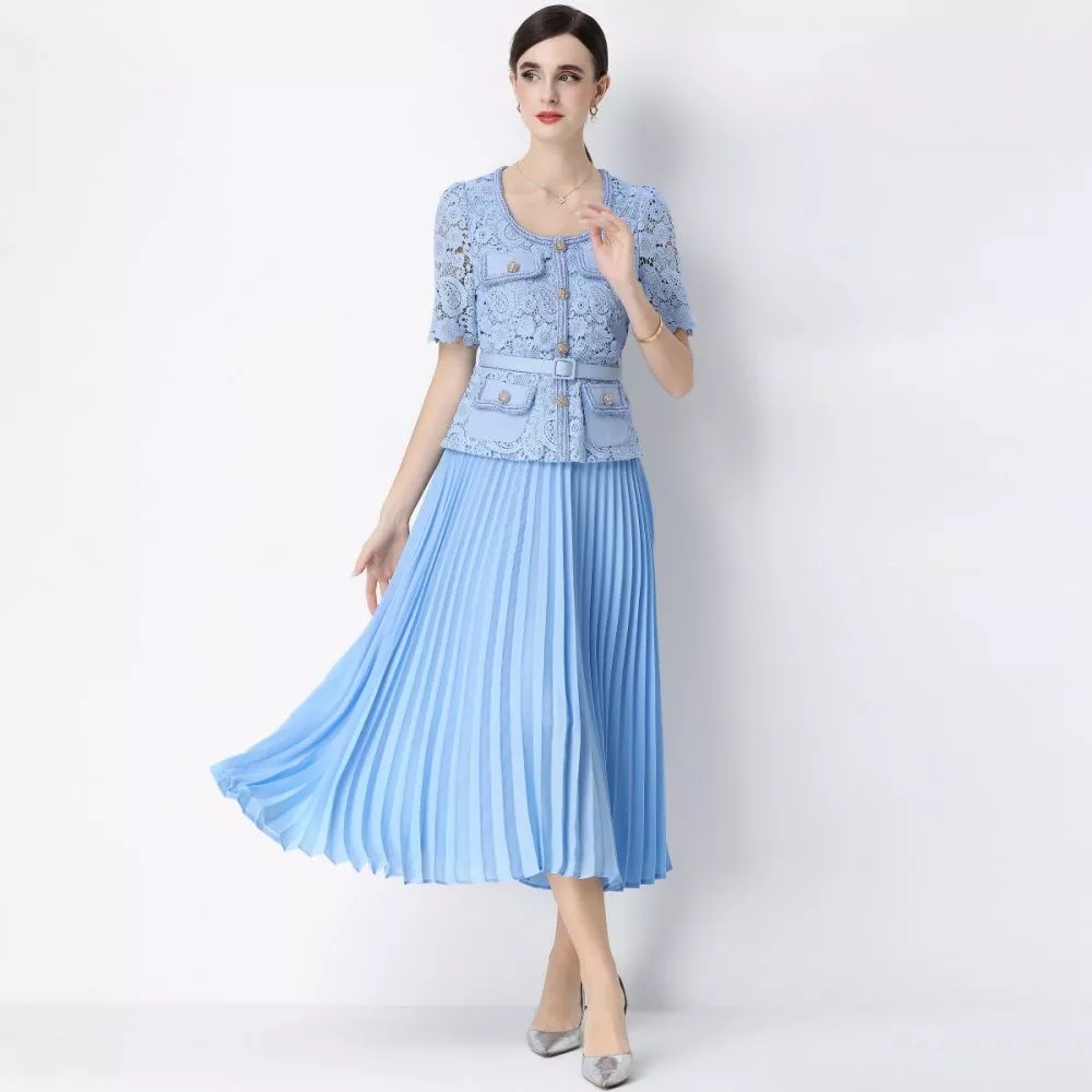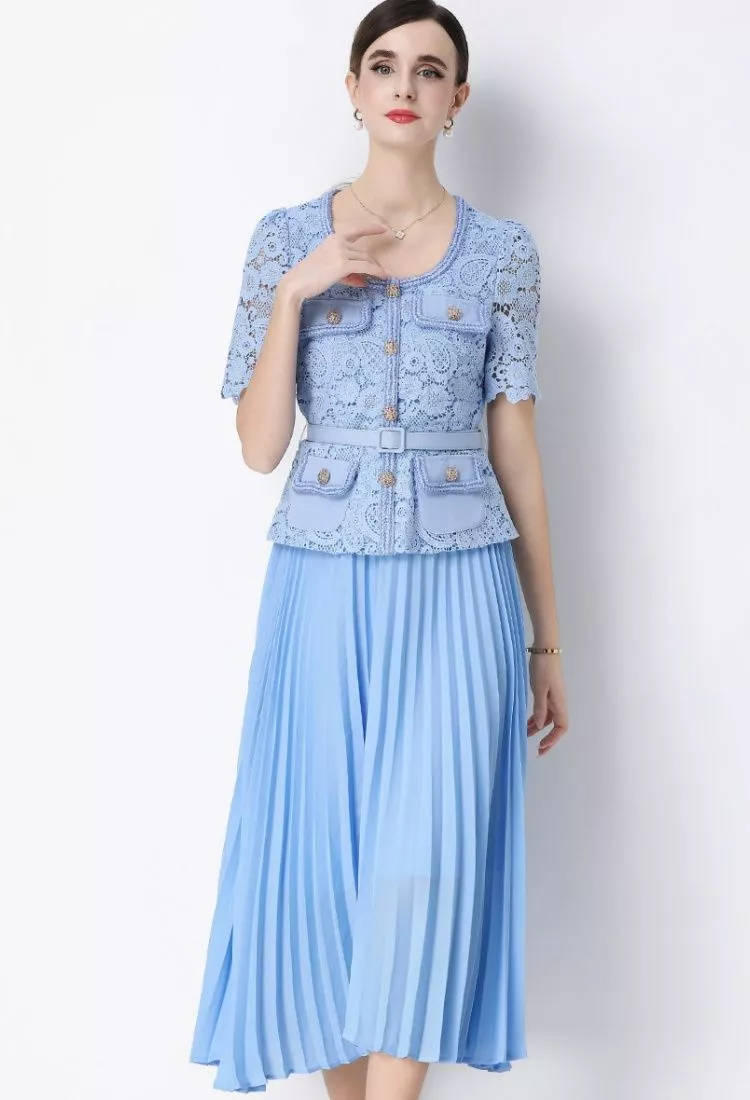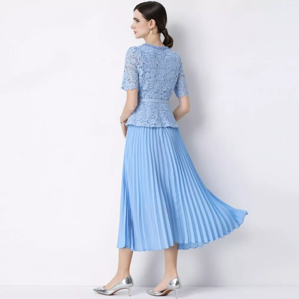 Vestito elegante midi ideale per cerimonie ed eventi raffinati. Il corpetto in pizzo lavorato si abbina alla gonna plissé creando un look femminile e sofisticato. La cintura coordinata valorizza la silhouette e dona armonia al design, rendendo il capo perfetto per invitata e occasioni speciali.