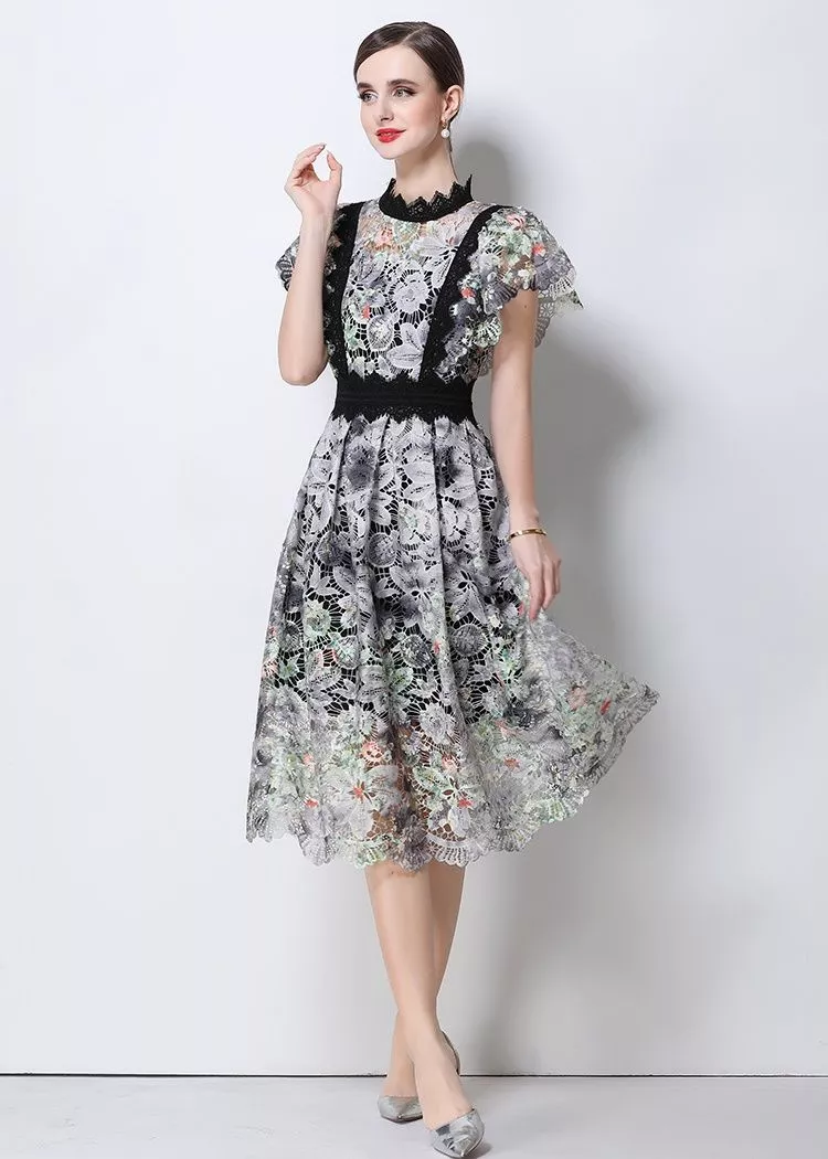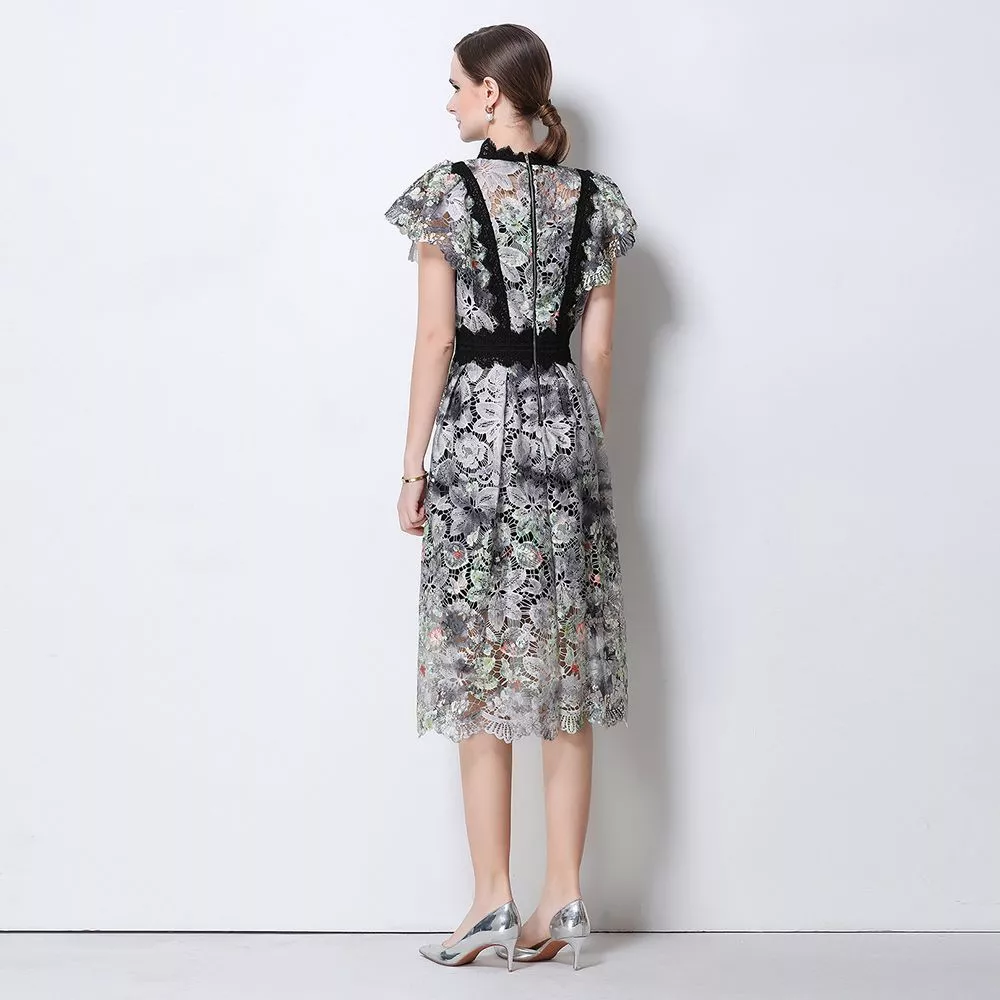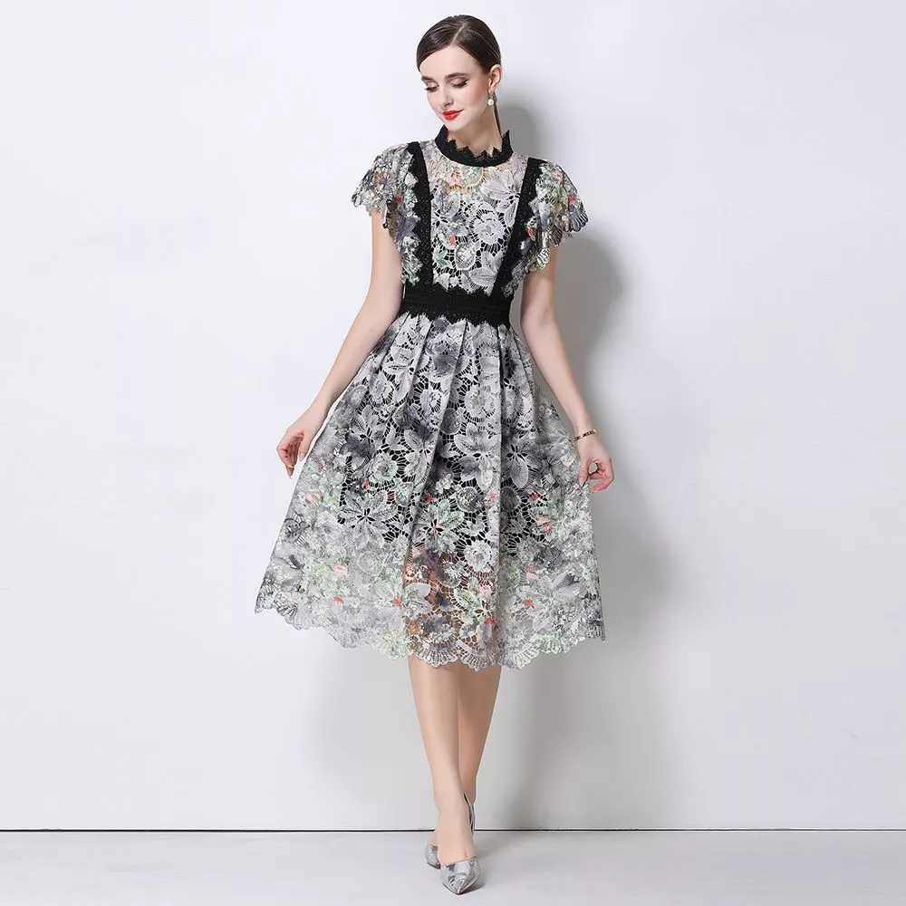 Vestito midi elegante realizzato in raffinato pizzo ricamato con motivo floreale che dona al capo un aspetto sofisticato e femminile. Il corpetto strutturato valorizza la silhouette mentre la vita definita crea una linea armoniosa e slanciata. Le maniche corte in pizzo aggiungono un tocco romantico mentre la gonna midi leggermente svasata completa il look con eleganza. Un abito perfetto per cerimonie ed eventi in cui si desidera uno stile ricercato e raffinato.