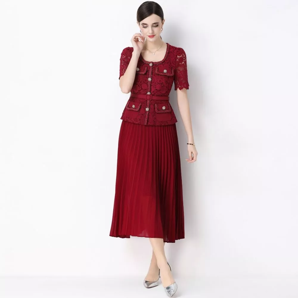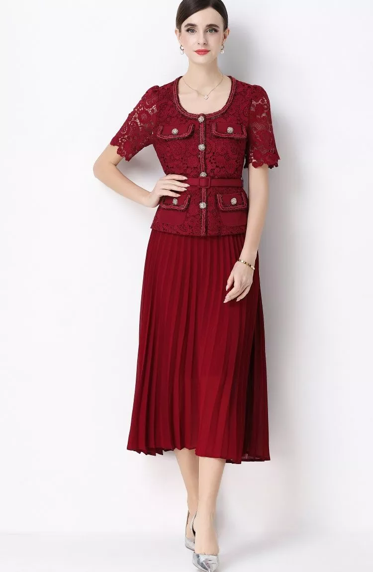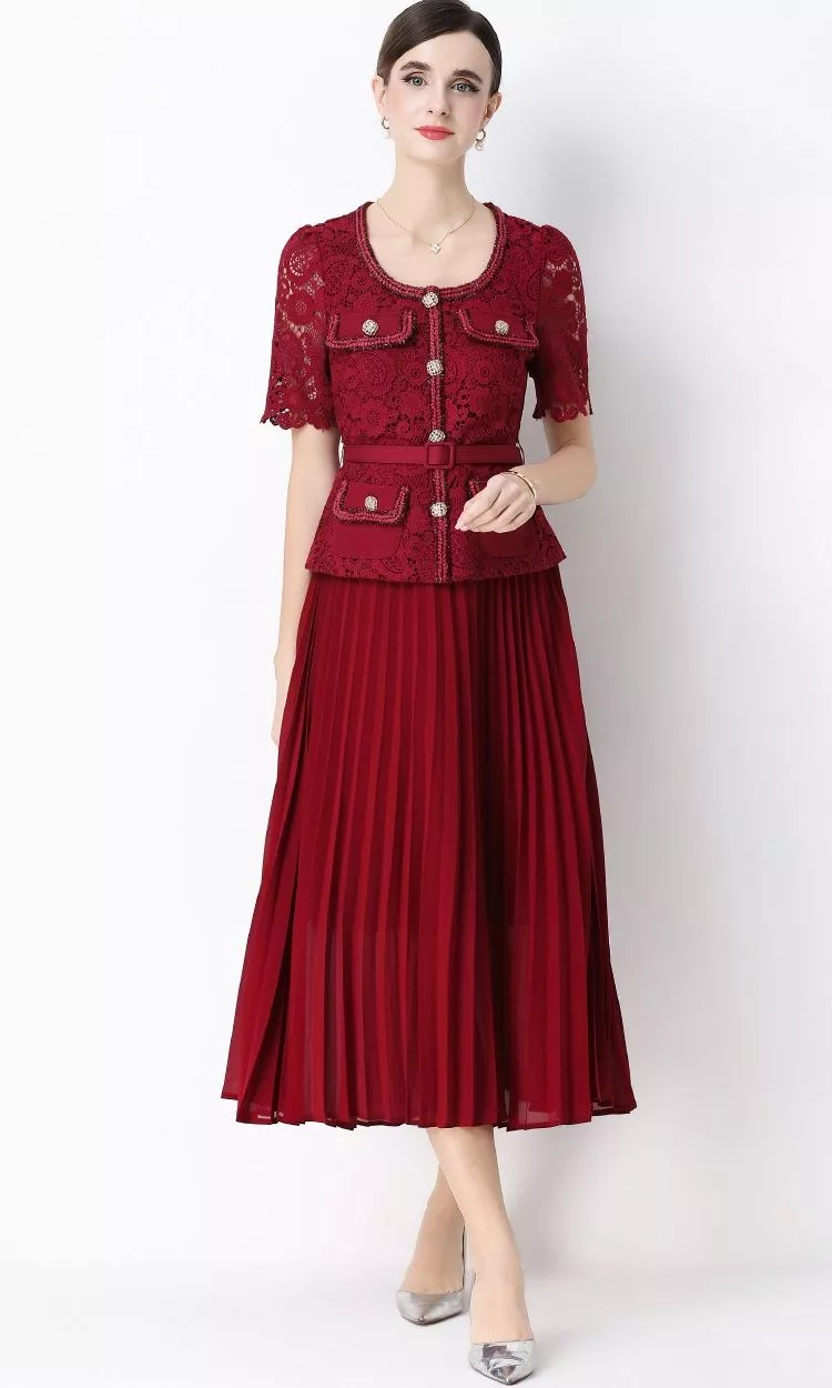 Vestito elegante midi perfetto per cerimonie, eventi e occasioni speciali. Il raffinato corpetto in pizzo si abbina alla gonna plissé creando un look femminile e sofisticato. La cintura coordinata valorizza la silhouette e dona armonia al design, rendendo il capo ideale per outfit eleganti e invitata.
