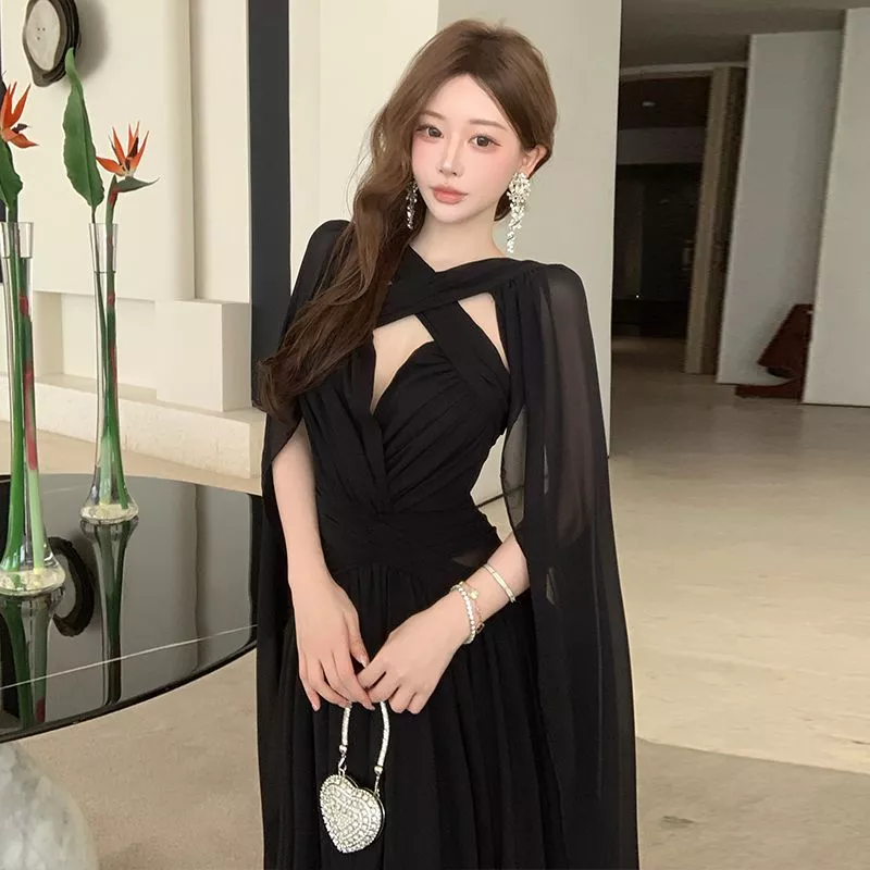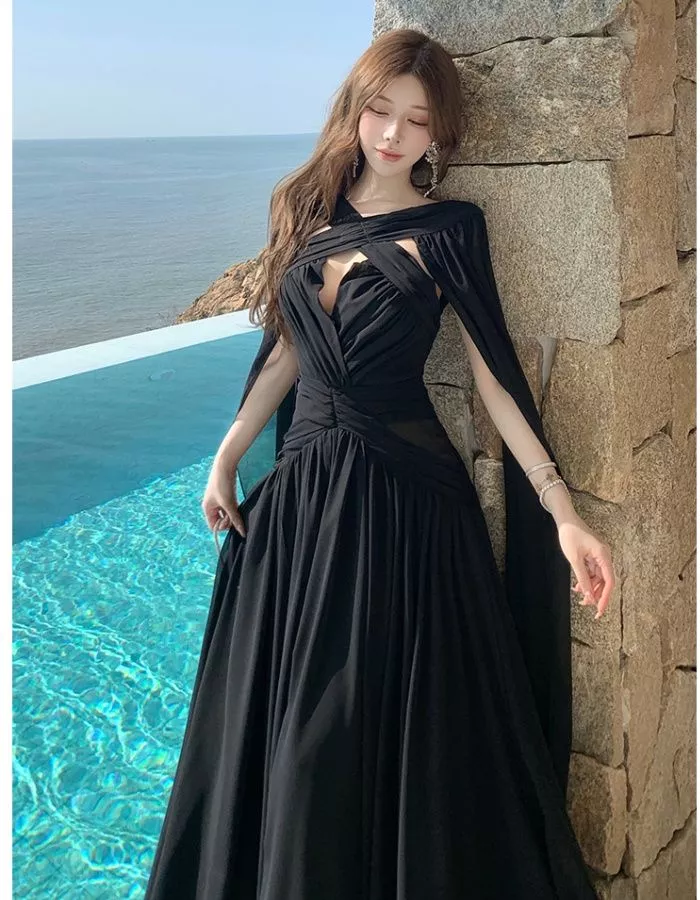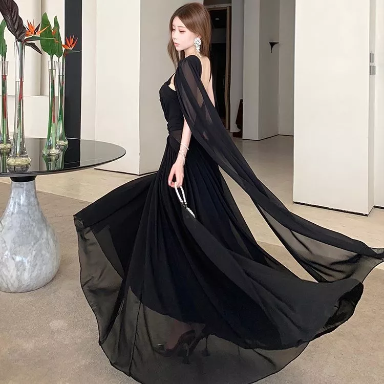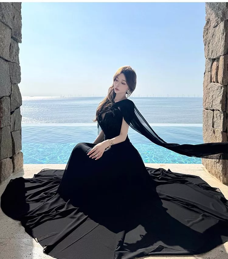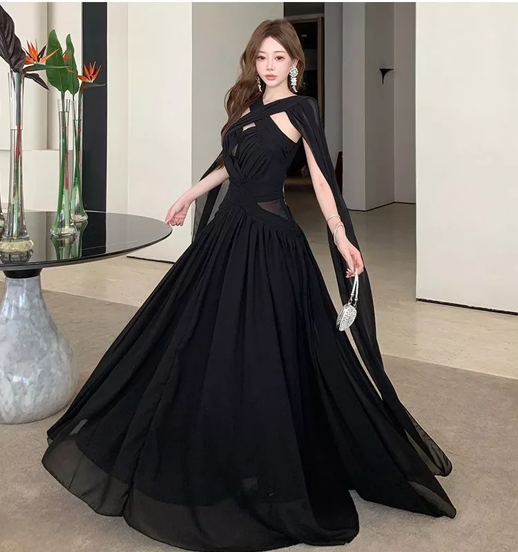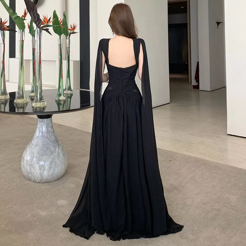 Vestito lungo elegante nero dal design scenografico perfetto per cerimonie serali ed eventi esclusivi. Il drappeggio sul busto e il velo sulle spalle creano un effetto raffinato e femminile, mentre la gonna ampia dona movimento e presenza scenica.
