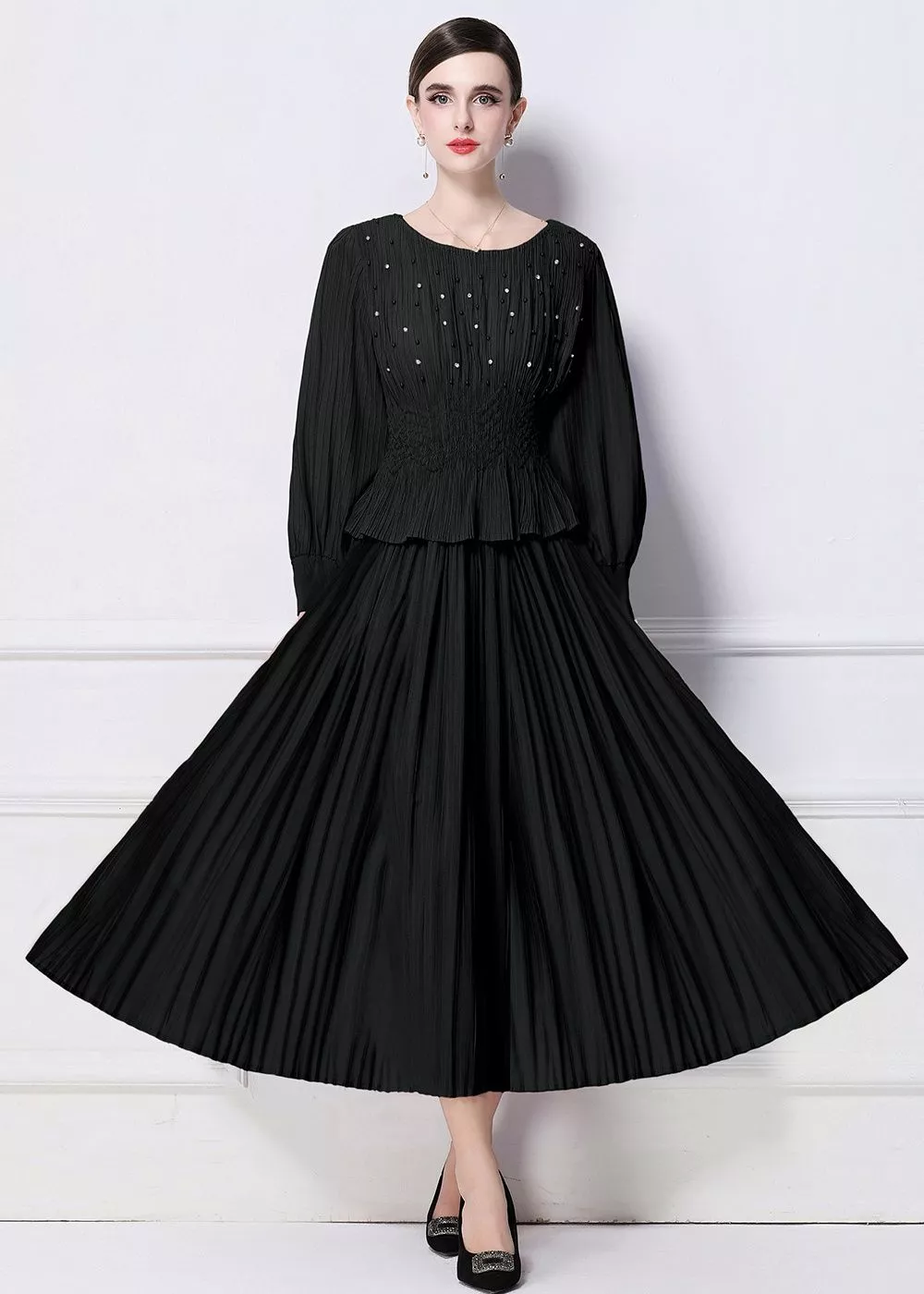 Vestito Elegante Plissé Con Perline Manica Lunga Nero Cerimonia Midi CF58963
