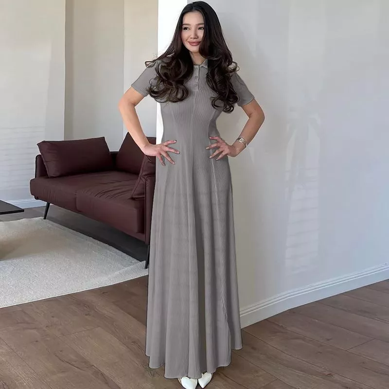 Vestito Grigio Lungo Donna Casual Chic Colletto Camicia Maniche Corte CF54424