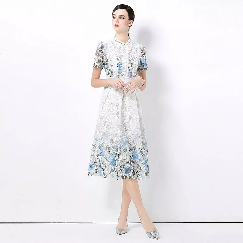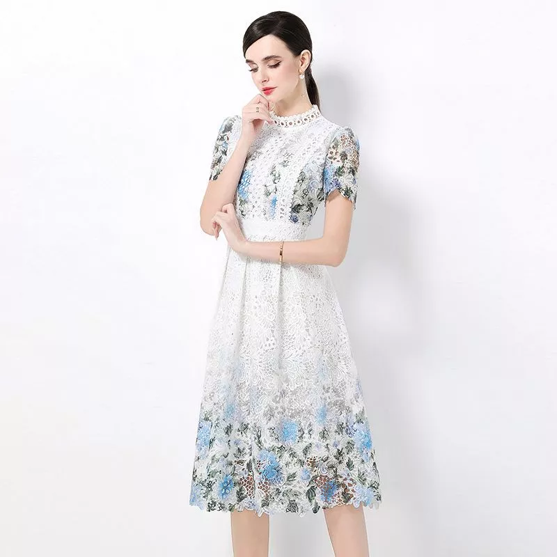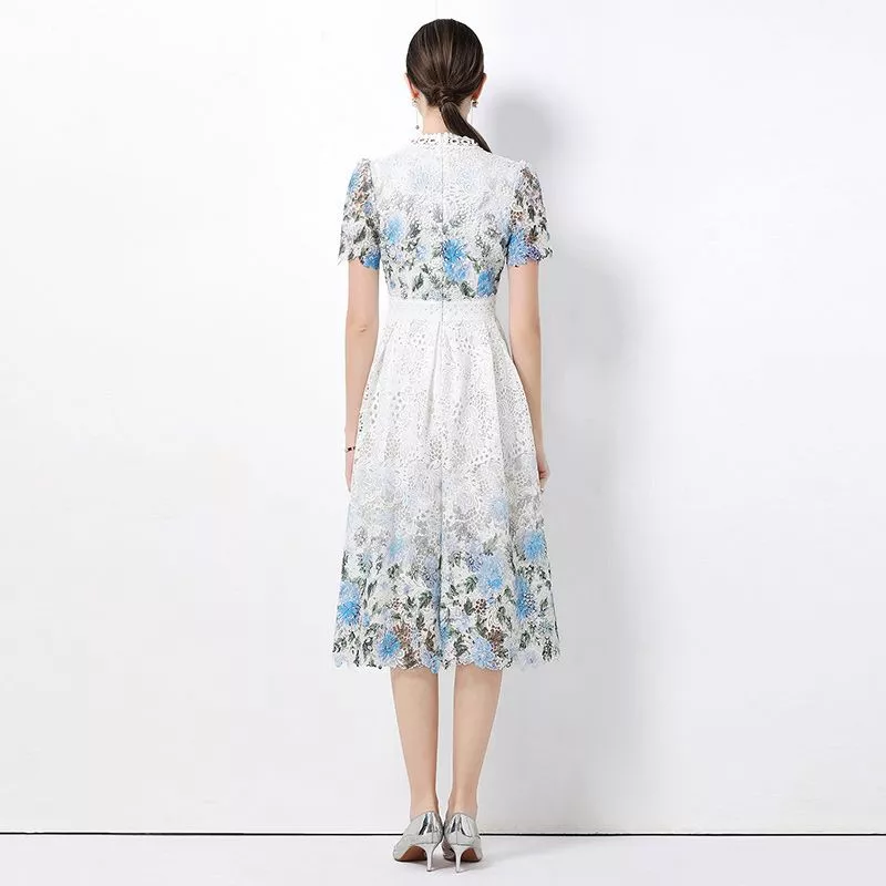 Vestito longuette donna in pizzo floreale, caratterizzato da una raffinata fantasia nei toni dell’azzurro chiaro e blu polvere su base bianco avorio. Il modello presenta maniche corte, busto strutturato e vita definita, che valorizzano la figura con equilibrio ed eleganza. La lunghezza sotto il ginocchio conferisce un aspetto bon ton e femminile, mentre la gonna leggermente svasata dona movimento e leggerezza. Un abito ideale per cerimonie diurne, eventi eleganti, occasioni speciali o look curati da giorno, pensato per chi cerca uno stile romantico ma ordinato, senza eccessi.