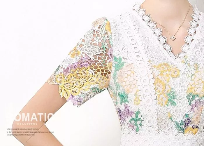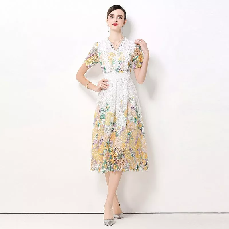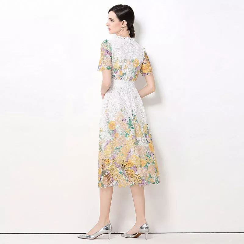 Vestito longuette donna in pizzo con elegante fantasia floreale nei toni del giallo chiaro, impreziosito da inserti multicolor delicati. Il modello presenta scollo a V, maniche corte e un busto ben strutturato che valorizza la figura, accompagnato da una lunghezza sotto il ginocchio raffinata e femminile. La gonna leggermente svasata dona equilibrio e movimento, rendendo l’abito ideale per eventi diurni, cerimonie informali, occasioni speciali o look eleganti da giorno. Un vestito luminoso e armonioso, pensato per chi cerca stile e raffinatezza senza eccessi.