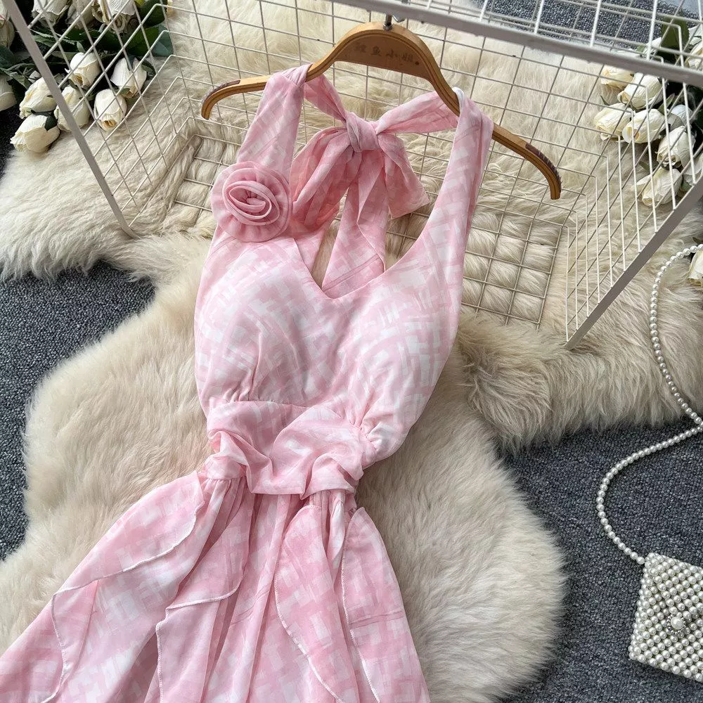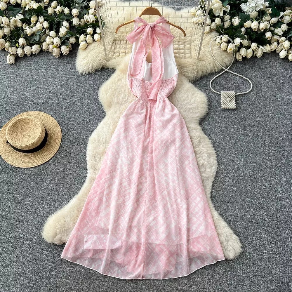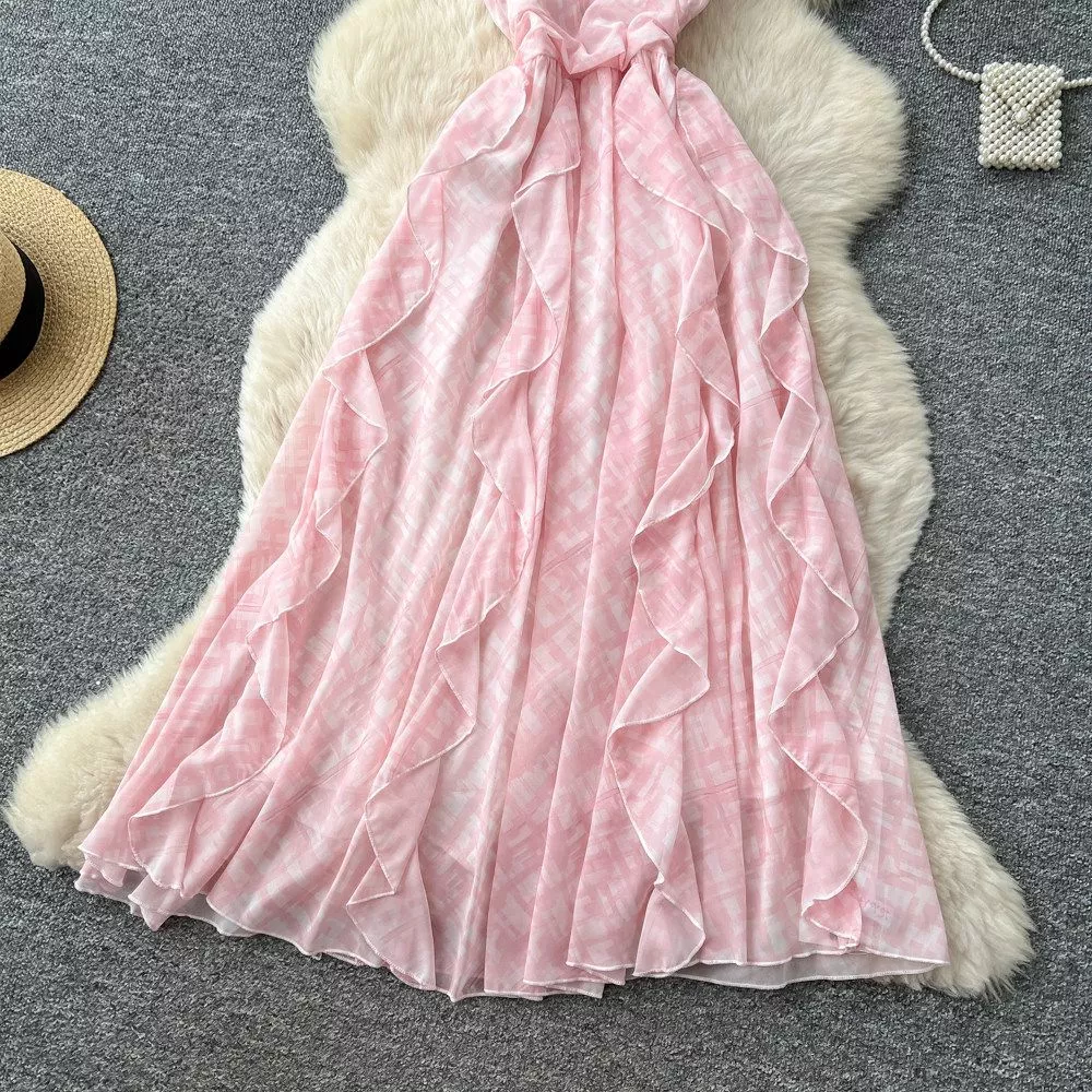 Vestito Lungo A Quadri Con Balze E Fiocco Elegante Cerimonia Rosa CF67850