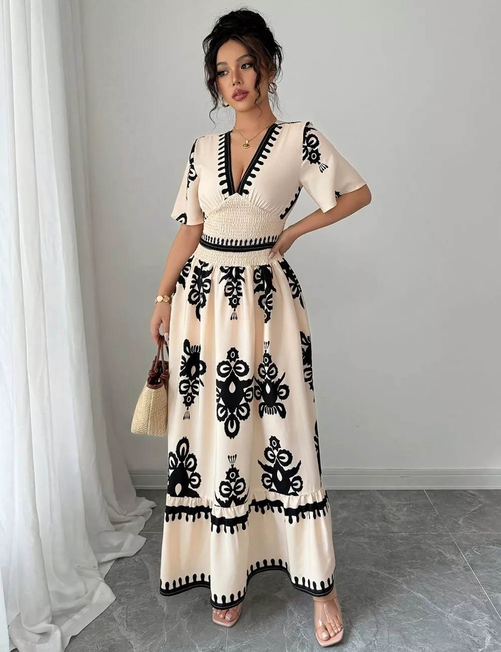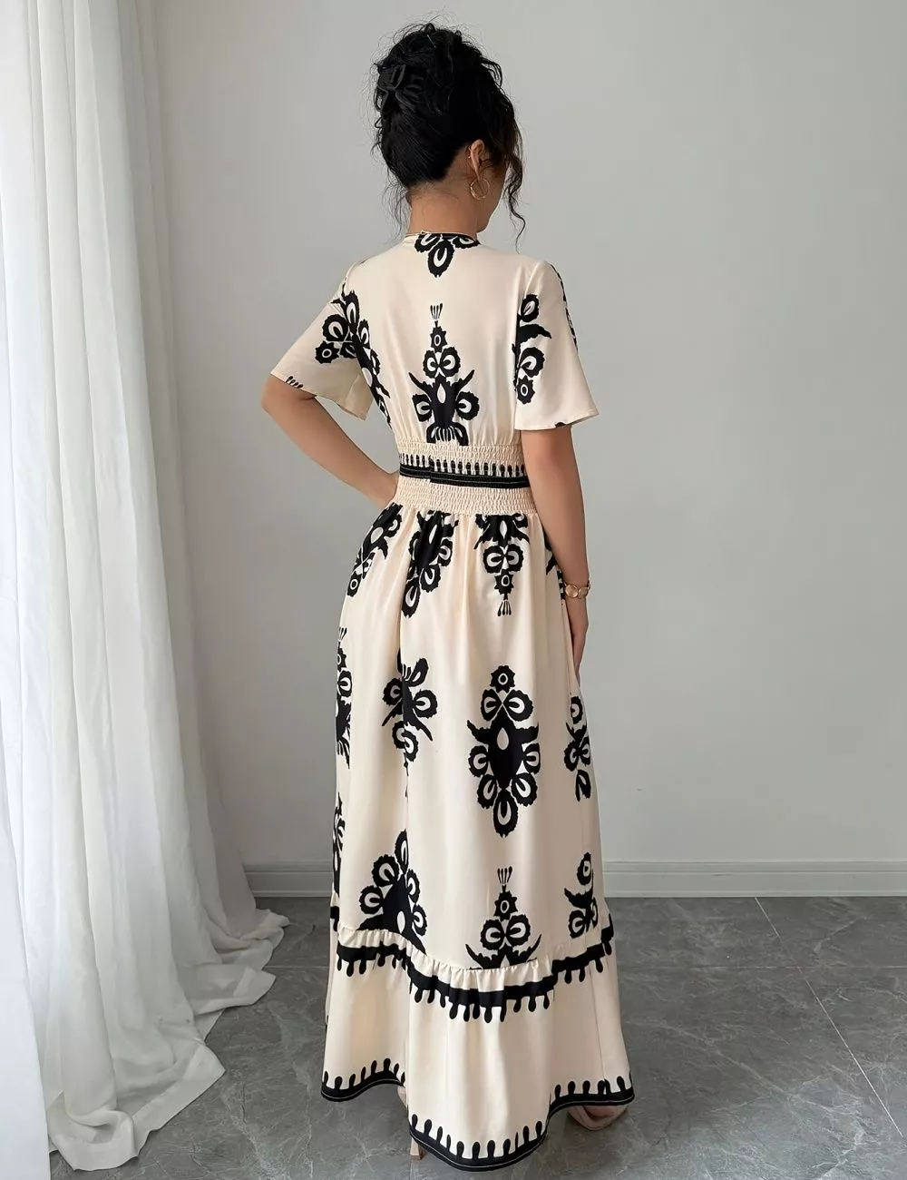 Vestito lungo dallo stile boho elegante, caratterizzato da stampa etnica nera su fondo beige panna. Lo scollo a V valorizza il décolleté mentre la vita elasticizzata arricciata definisce la silhouette con naturalezza.