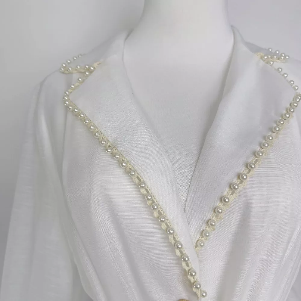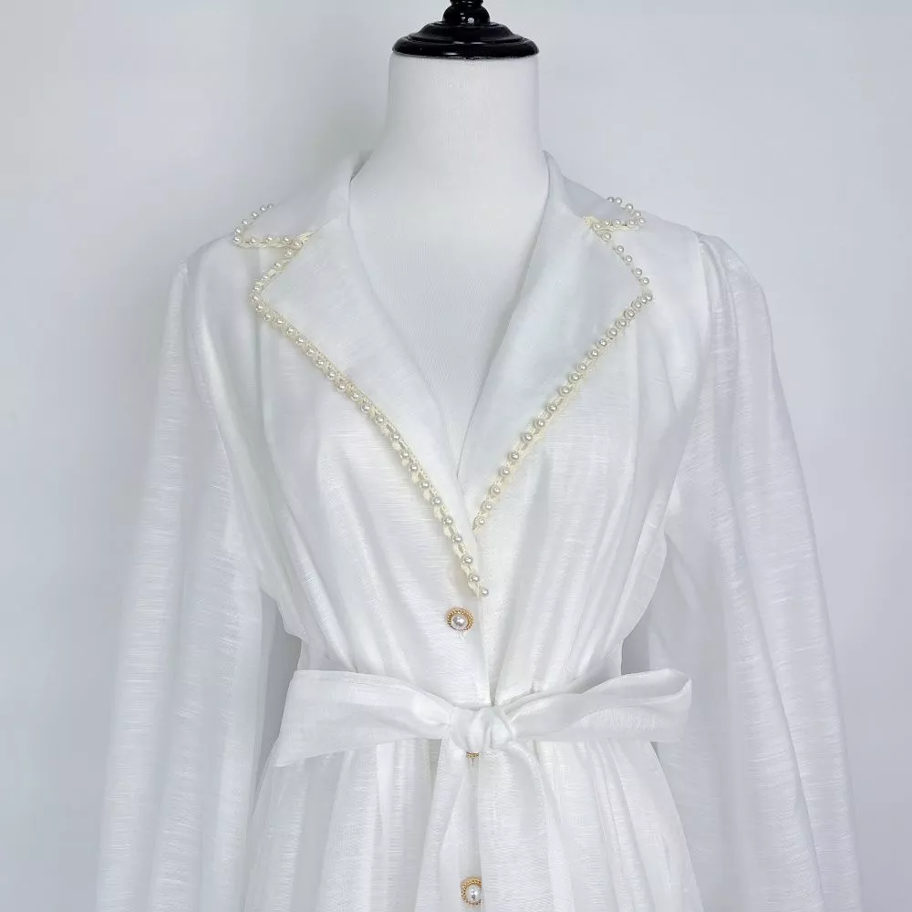Lo scollo a V slancia la silhouette, mentre la cintura coordinata in vita consente di regolare la vestibilità creando una forma armoniosa. Le maniche lunghe leggere donano equilibrio al capo, mentre la gonna ampia con balza finale aggiunge movimento e un tocco romantico all'insieme.
