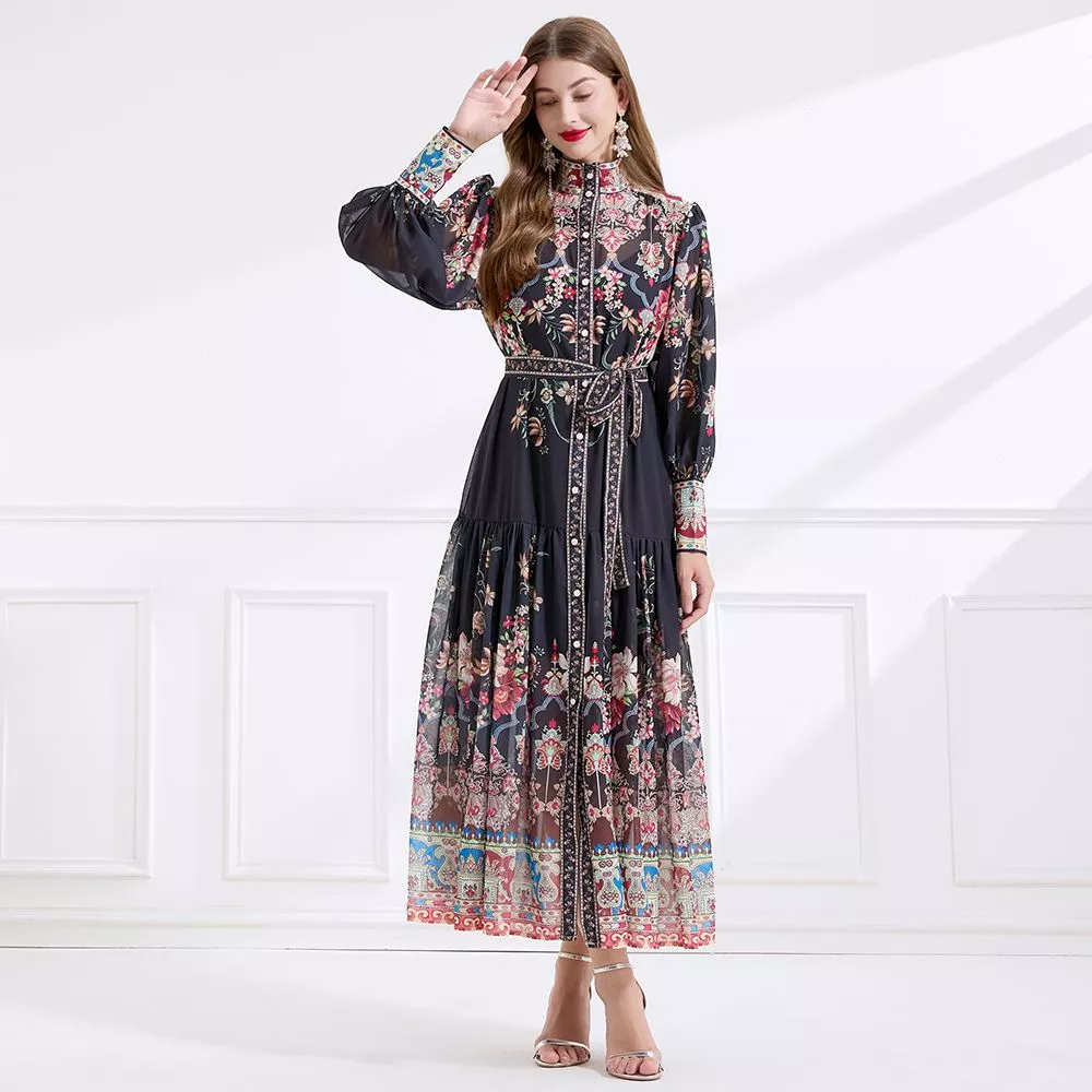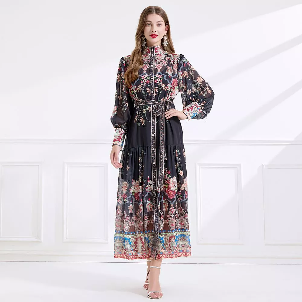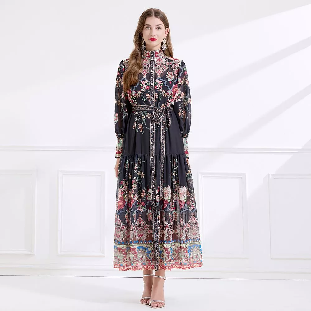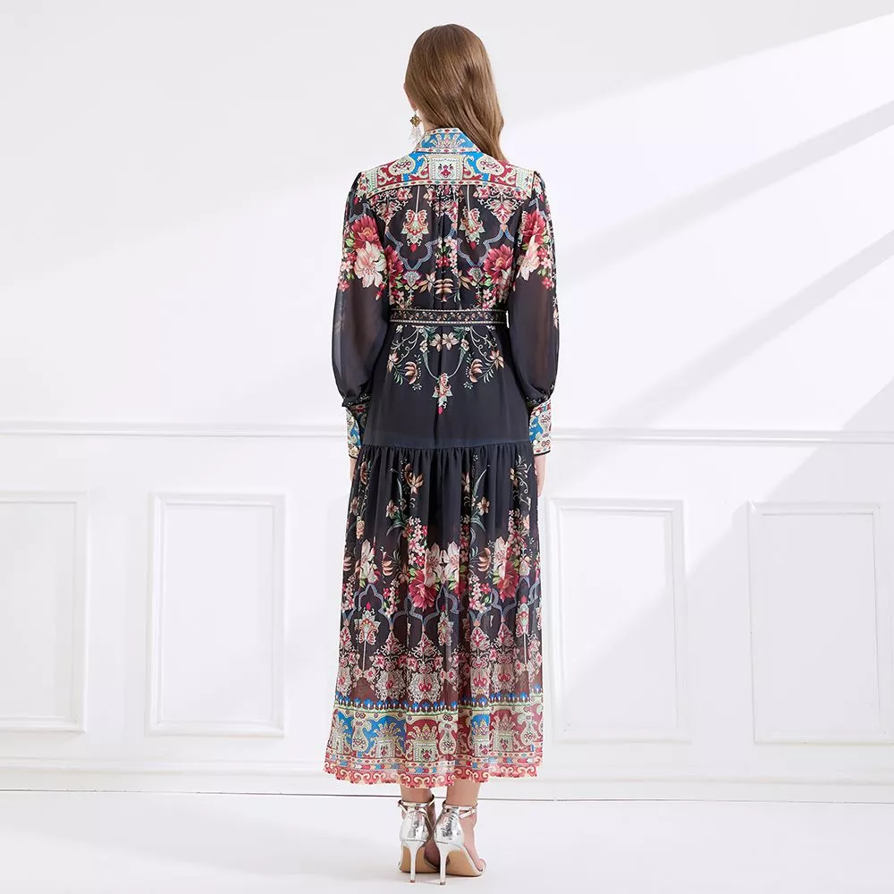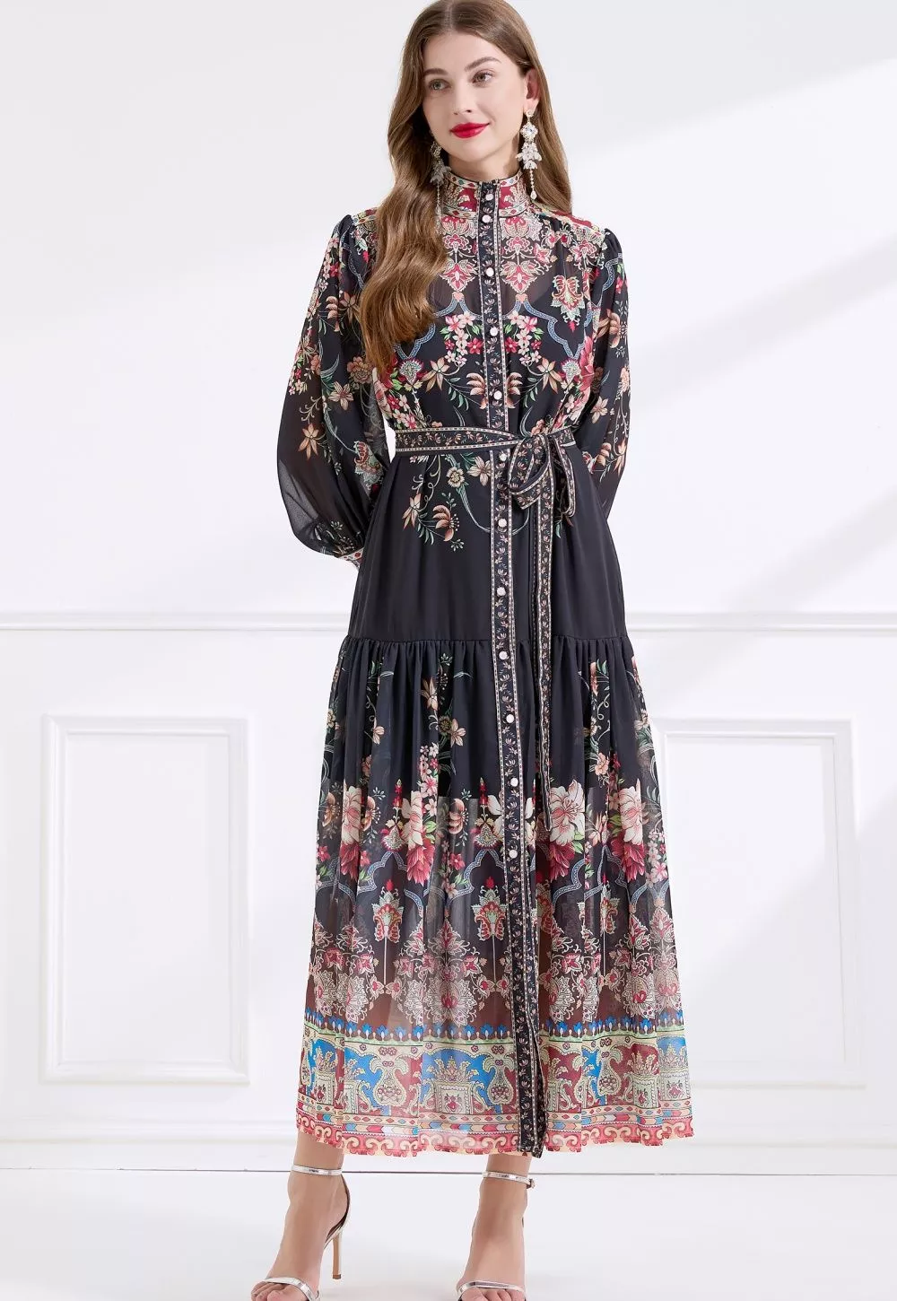 Abito lungo dalla linea scorrevole con stampa barocca multicolore nei toni del blu, oro e rosso, caratterizzato da cintura coordinata in vita che scolpisce la figura con equilibrio e grazia.
