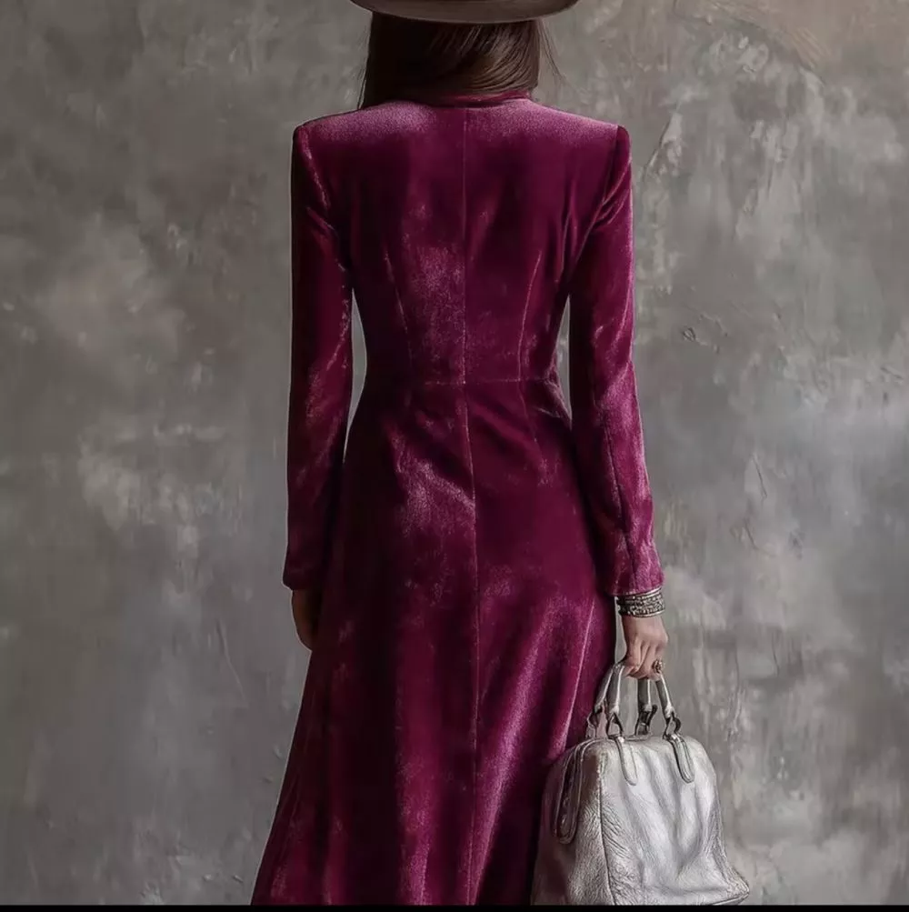 Vestito lungo da donna dal forte impatto visivo, diventato virale per il suo design doppiopetto e lo spacco sensuale che accompagna il movimento. La linea strutturata nella parte superiore e fluida nella gonna crea un equilibrio perfetto tra carattere deciso ed eleganza contemporanea.