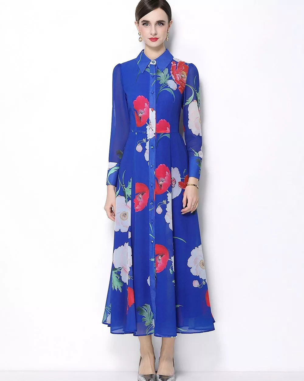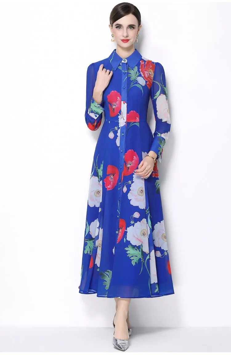 Vestito lungo stile camicia da donna con stampa floreale su base blu intensa, pensato per valorizzare la figura con una linea slanciata e femminile. Il design a camicia con bottoni frontali dona struttura al capo, mentre la gonna fluida accompagna il movimento con eleganza. Un modello ideale per eventi, cerimonie, occasioni eleganti e appuntamenti speciali, facile da completare con décolleté o sandali raffinati.