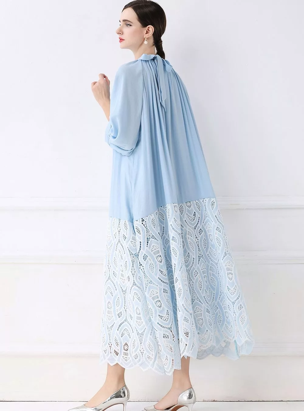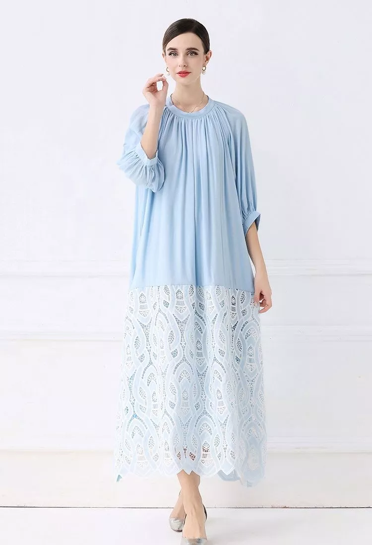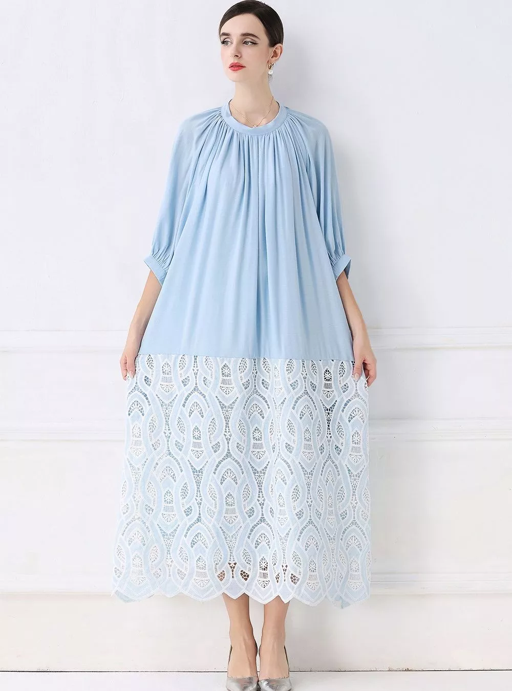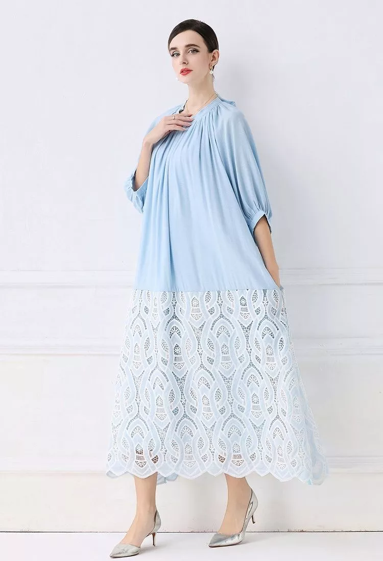 Questo vestito lungo con inserto in pizzo ricamato dona un’eleganza delicata e moderna, perfetta per cerimonie e occasioni formali. La parte superiore morbida con maniche ampie 3/4 scivola con leggerezza, mentre la gonna in pizzo crea un contrasto raffinato che slancia la figura. Le tonalità disponibili offrono due interpretazioni di stile: il celeste per un look luminoso e romantico, il marrone tabacco per un effetto più caldo e sofisticato. Un modello ideale per chi desidera un abito elegante, femminile e con dettagli ricercati.