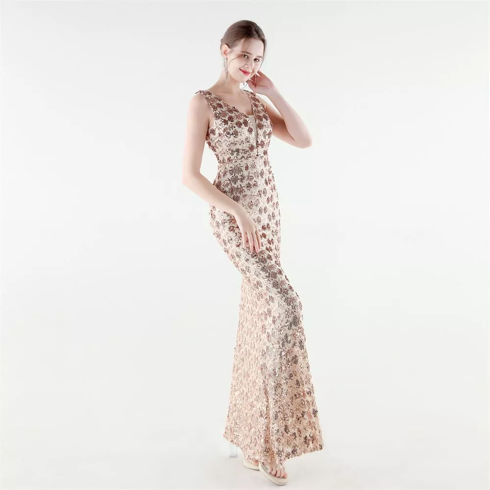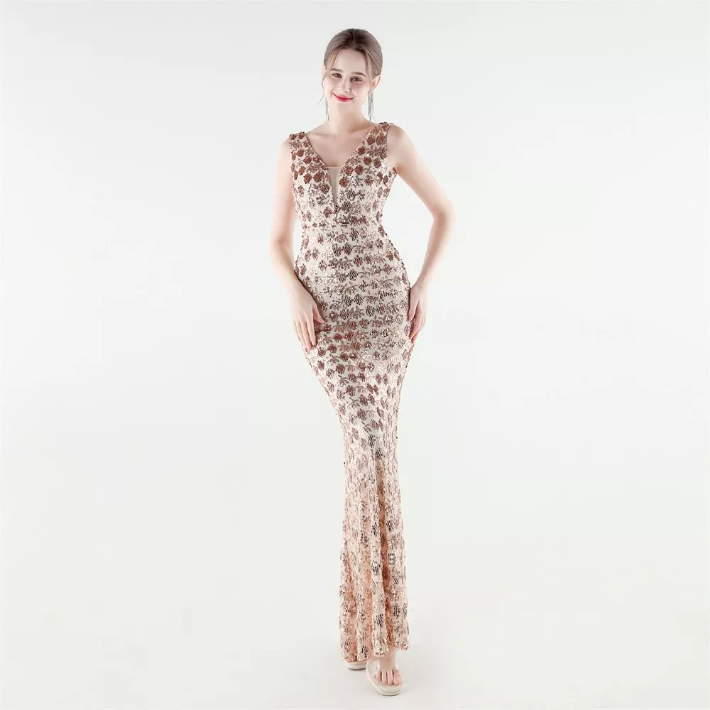Un vestito lungo d'impatto, pensato per valorizzare ogni silhouette con un tocco sensuale ed elegante. Il ricamo luminoso dona movimento e raffinatezza, mentre la linea sirena scolpisce il punto vita e allunga la figura. Il profondo scollo frontale aggiunge un accento moderno e seducente, mantenendo un'estetica sempre sofisticata. Perfetto per cerimonie, serate importanti, eventi formali e occasioni speciali in cui desideri brillare con classe.