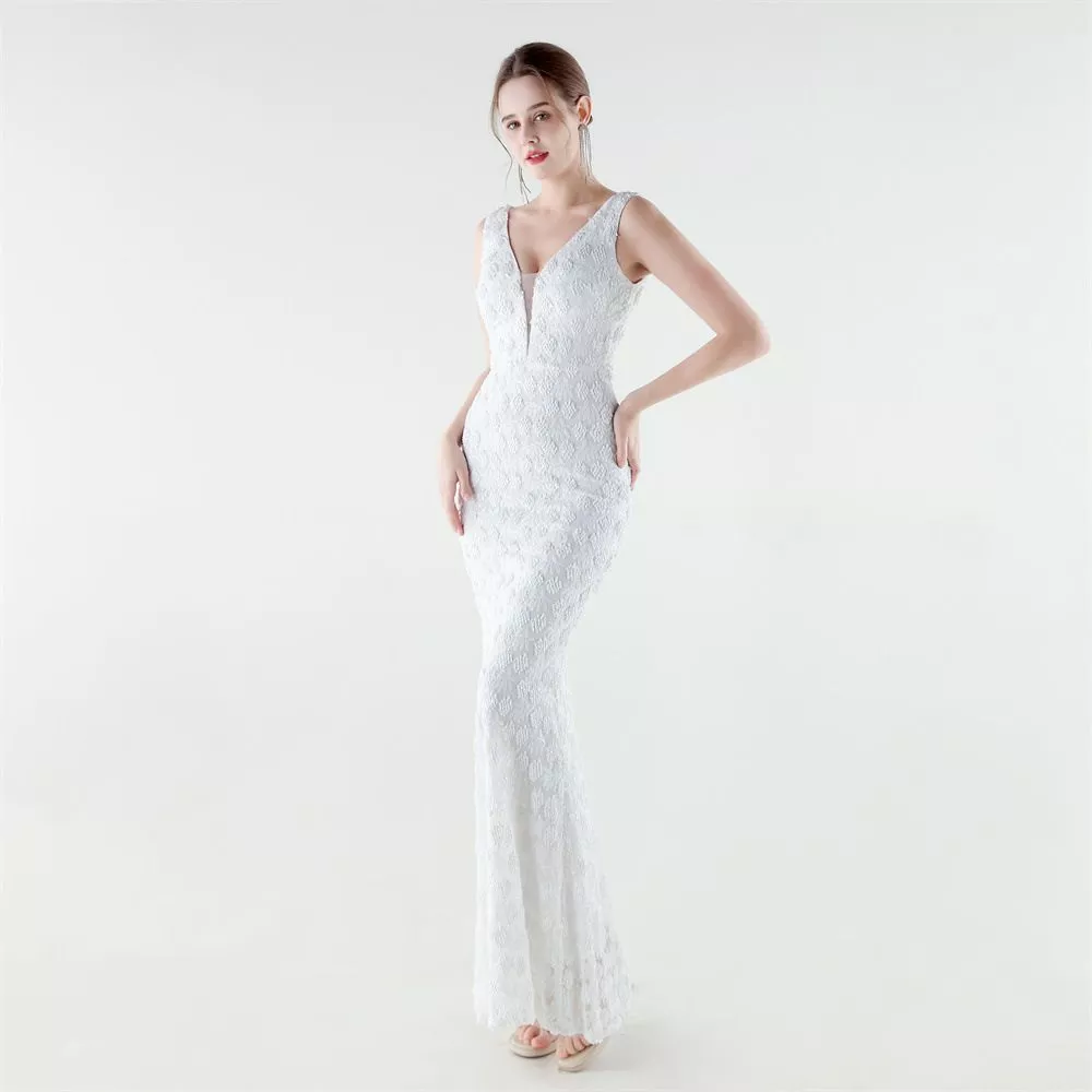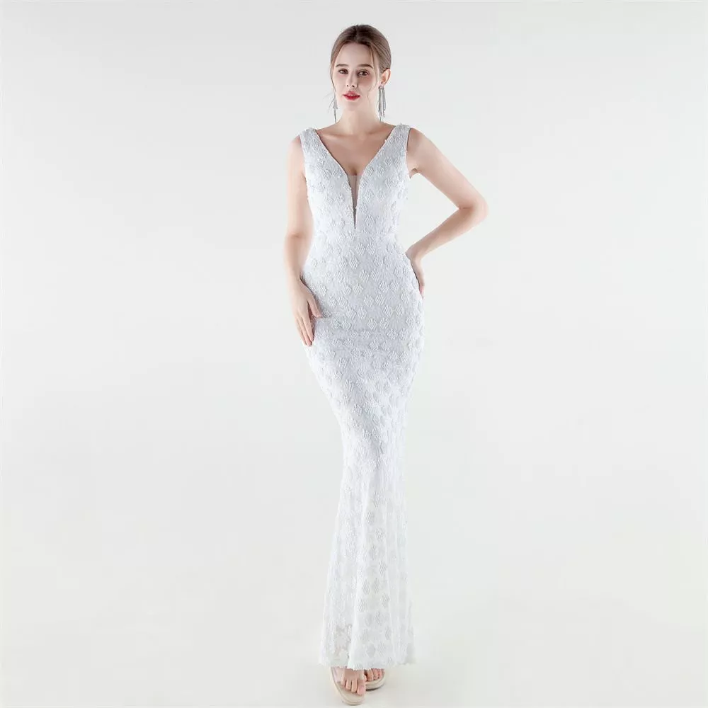 Vestito Lungo Cerimonia Ricamato Sirena Scollo Profondo Elegante Bianco CF61195