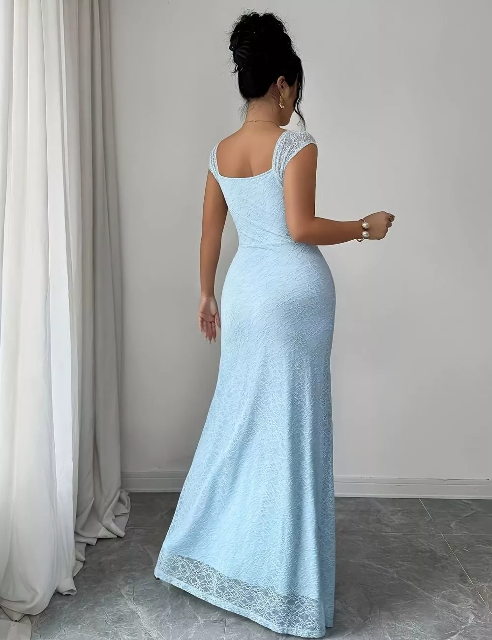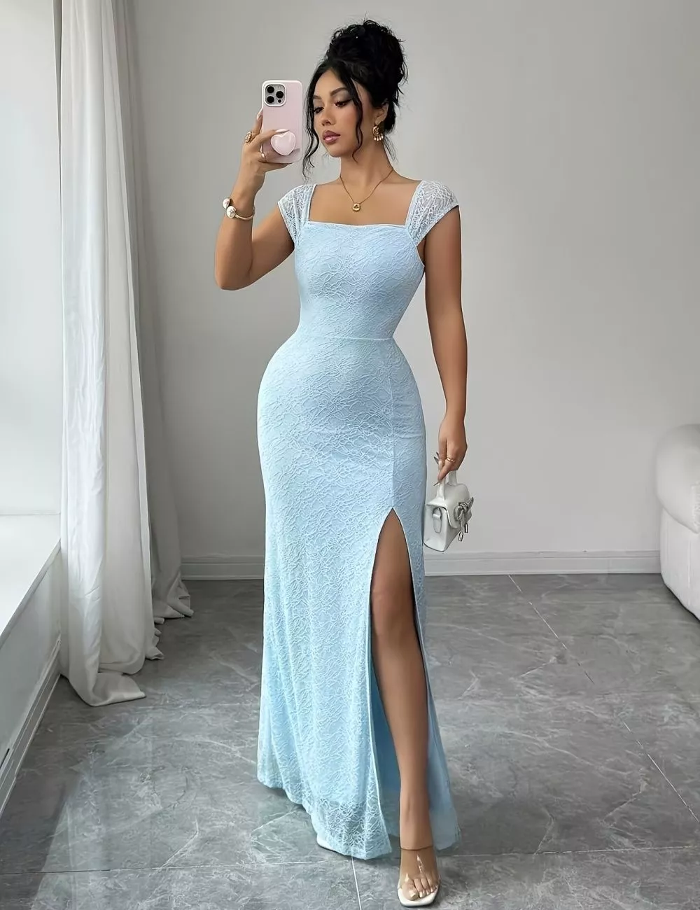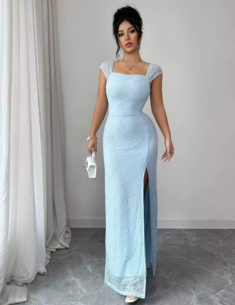 Vestito lungo donna in pizzo dal design elegante e sofisticato, perfetto per valorizzare la silhouette con una linea aderente e femminile. Il taglio con spacco alto slancia la figura e dona un tocco sensuale, mentre il tessuto lavorato effetto pizzo aggiunge raffinatezza al look. Le spalle con inserto in pizzo completano il design rendendolo ideale per occasioni speciali e outfit da cerimonia.