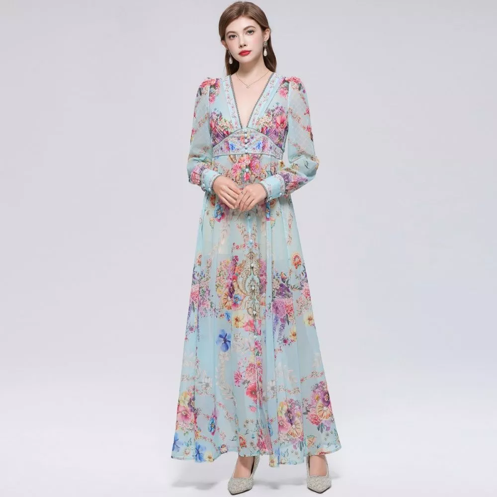 Vestito Lungo Donna Azzurro Floreale Raffinato con Maniche Lunghe CF71014