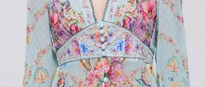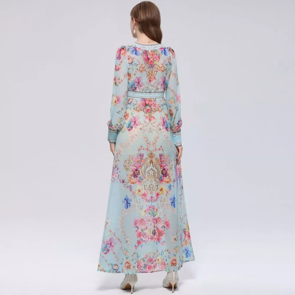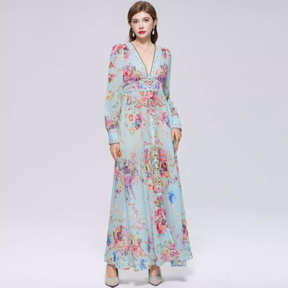 Vestito lungo elegante da donna in tonalità azzurra con stampa floreale raffinata, caratterizzato da una linea strutturata che valorizza il busto e slancia la figura. Il design con bottoni frontali crea equilibrio visivo, mentre la vita alta definisce la silhouette con eleganza. Le maniche lunghe leggere aggiungono movimento, rendendo il capo ideale per un look curato e versatile adatto a diverse occasioni.