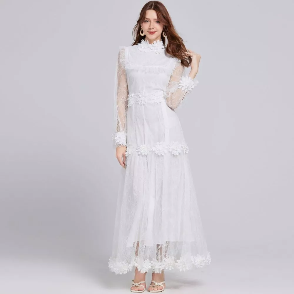 Vestito Lungo Donna Bianco In Pizzo Fiori Ricamati E Maniche Trasparenti CF62025