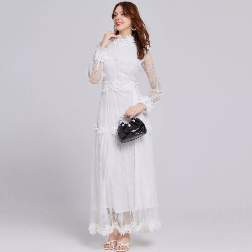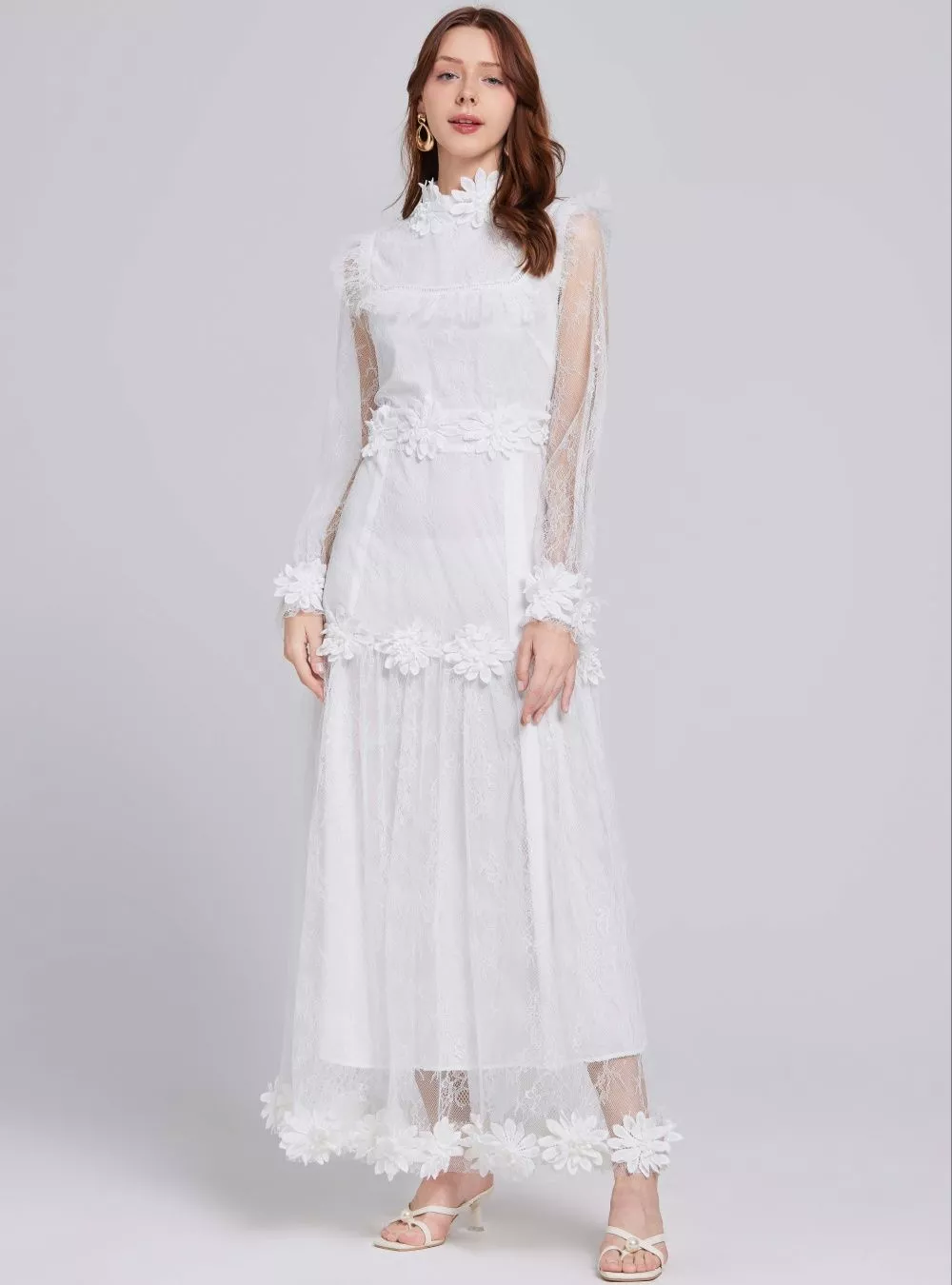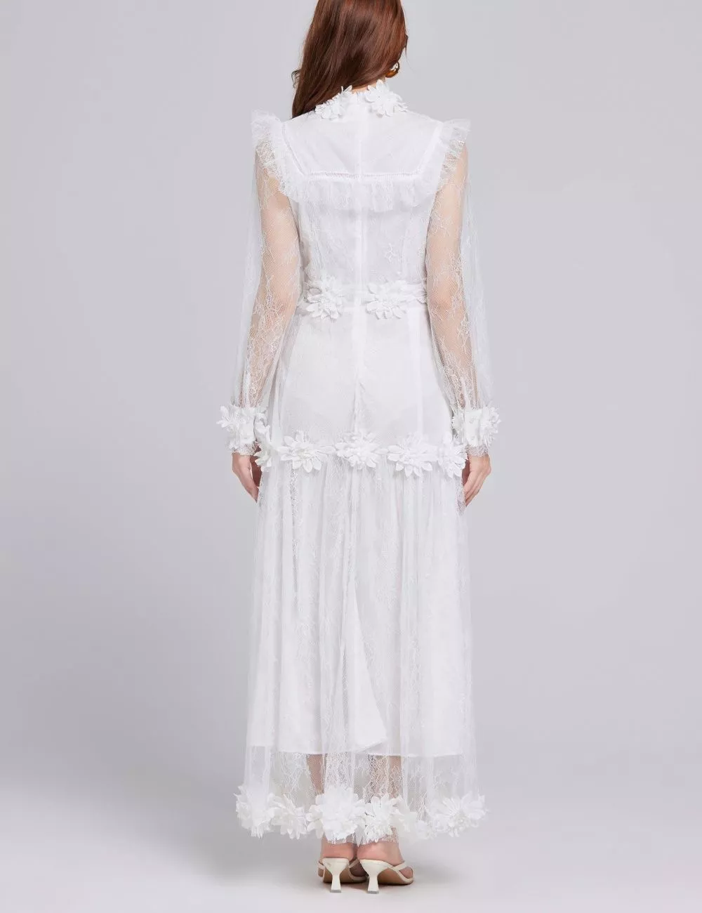 Vestito lungo da donna dal gusto romantico ed elegante, realizzato in pizzo lavorato con motivo floreale e impreziosito da applicazioni tridimensionali tono su tono. Il design slancia la figura grazie alla linea fluida e alla vita leggermente definita, mentre la trasparenza delle maniche lunghe dona leggerezza e raffinatezza all’insieme.