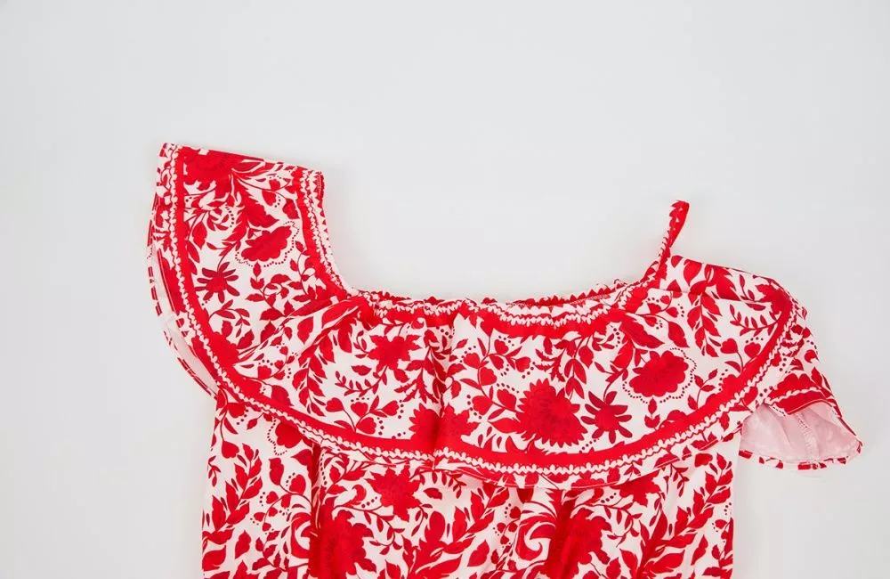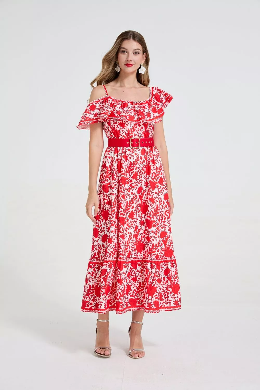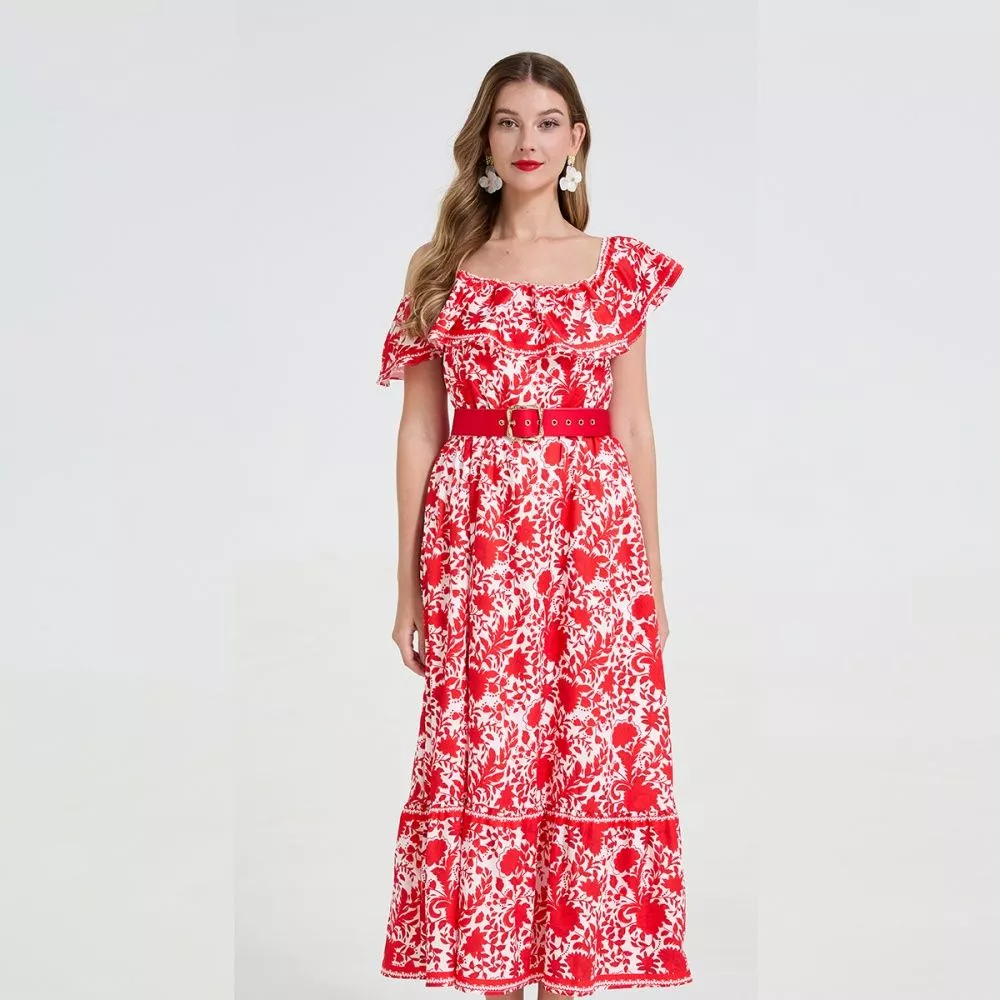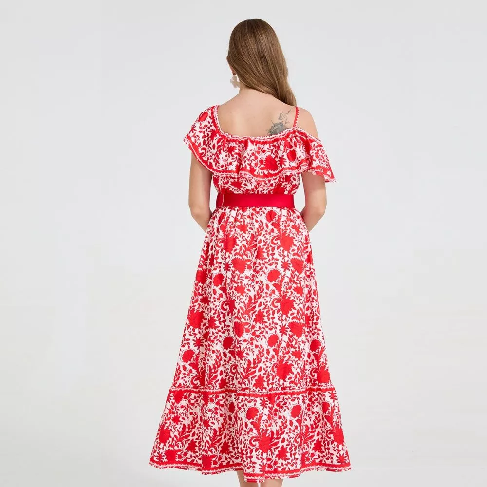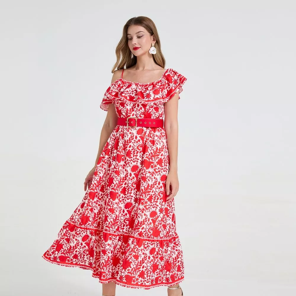 Vestito lungo elegante con fantasia floreale rossa su base chiara, caratterizzato da una linea femminile e moderna. Il corpetto presenta spalline sottili con volant arricciato che valorizza il décolleté, mentre la gonna ampia crea un effetto scenico e armonioso ad ogni movimento. La cintura rossa in vita definisce la silhouette e dona un tocco sofisticato al look. Perfetto per cerimonie, eventi, invitate o outfit raffinati da giorno. Il materiale sintetico assicura una vestibilità confortevole e leggera.
