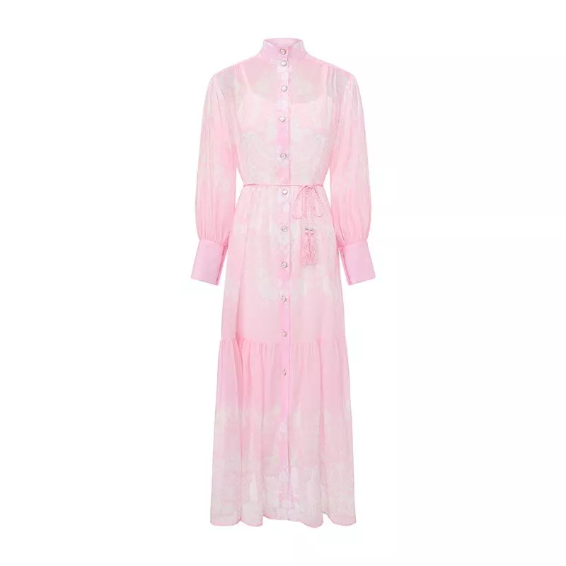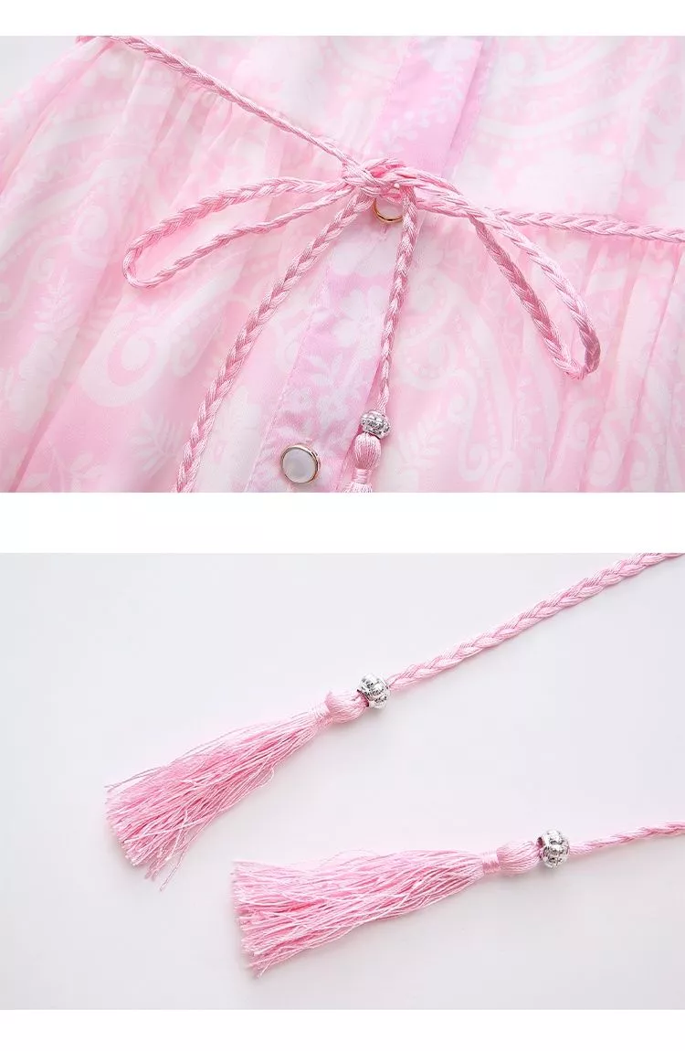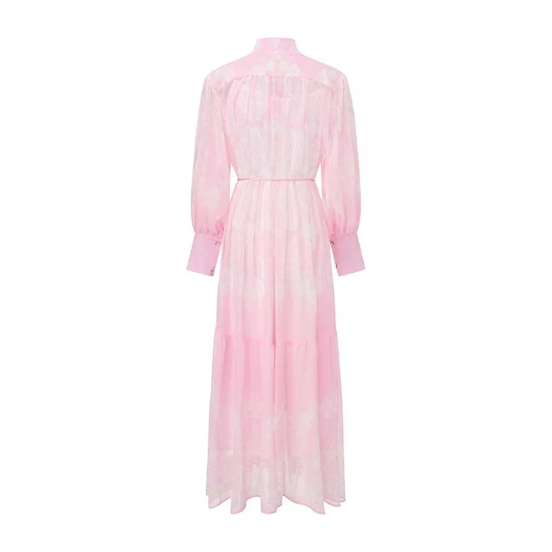 Vestito lungo da donna dallo stile elegante e raffinato, perfetto per la stagione primaverile ed estiva. Il design in tonalità rosa con stampa floreale delicata dona un aspetto luminoso e femminile, ideale per occasioni speciali, eventi o look curati da giorno.